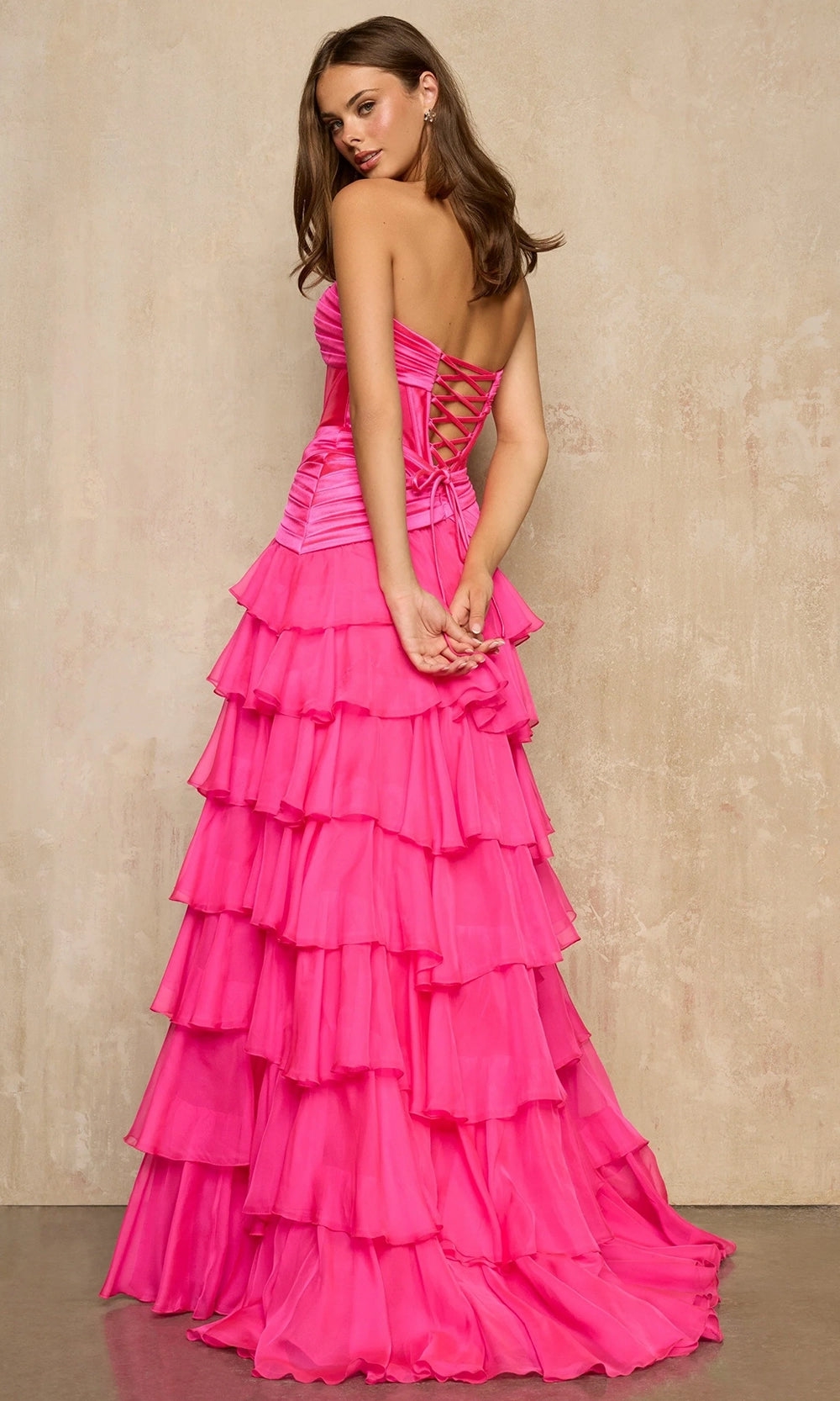 | Details: | Crisscross Pleated Bodice, Strapless, Tiered Ruffle Skirt, High Slit, Open Lace-Up Back |