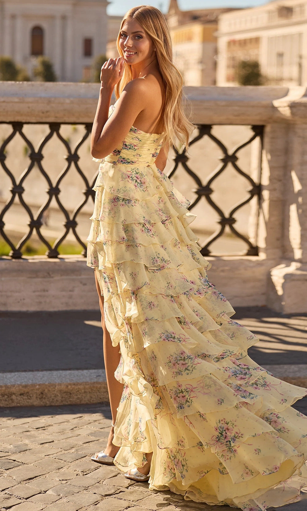 Energetic movement defines Sherri Hill 57907, a strapless ensemble that captures lightness and expression through layers of ruffles. The sweetheart neckline draws focus upward, while the bow accent introduces a delicate focal point. The ruffled A-line skirt reveals a playful yet sophisticated silhouette, offering freedom of movement and visual drama. Floral motifs lend depth to every tier, enhancing texture and vibrancy. Sherri Hill 57907 merges romantic charm and contemporary style, perfect for moments that call for standout presence and poise. Model is wearing Yellow Print color.