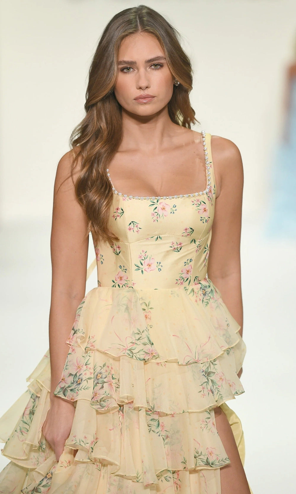 Sherri Hill 57911 captivates with a soft yet powerful aesthetic that moves fluidly with every step. The square neckline gently frames the shoulders, while the structured bodice offers a defined shape that flatters the natural waist. From there, tiered ruffles cascade gracefully, forming layers that create volume and rhythm. The floral print brings a touch of nature-inspired artistry, enhancing the A-line gown charm. A high slit introduces a modern edge to its romantic tone, making Sherri Hill 57911 a striking choice for gala evenings and formal celebrations. Model is wearing Light Yellow Print color.