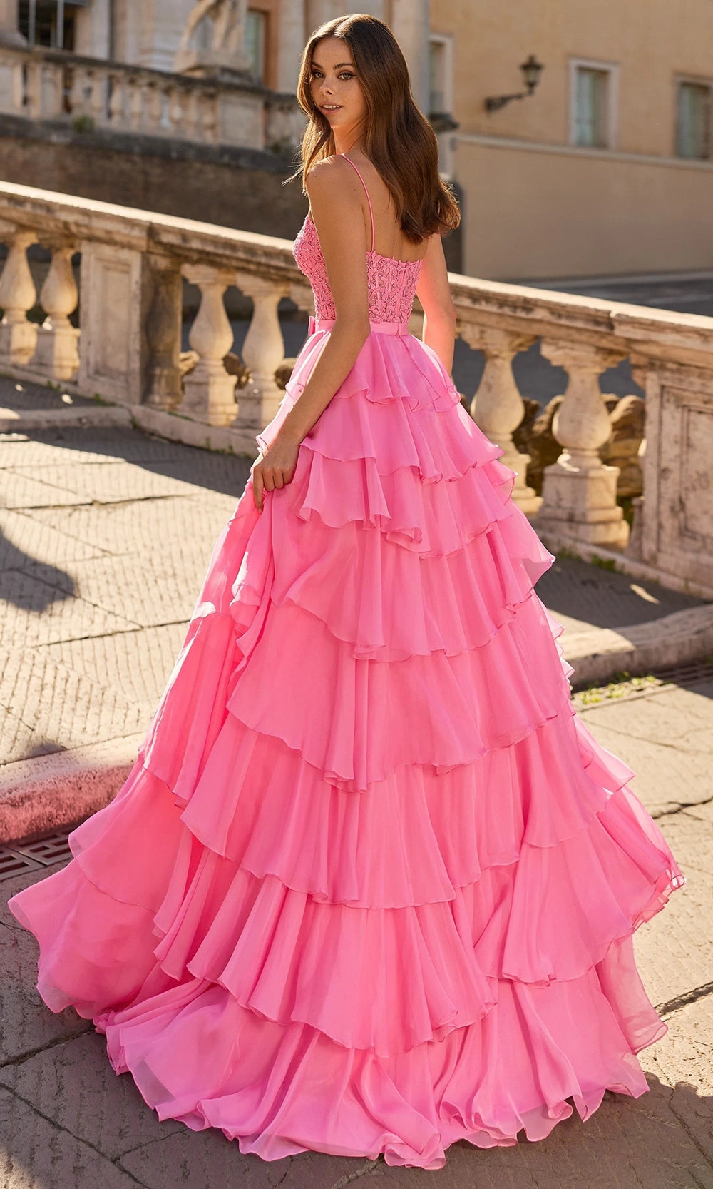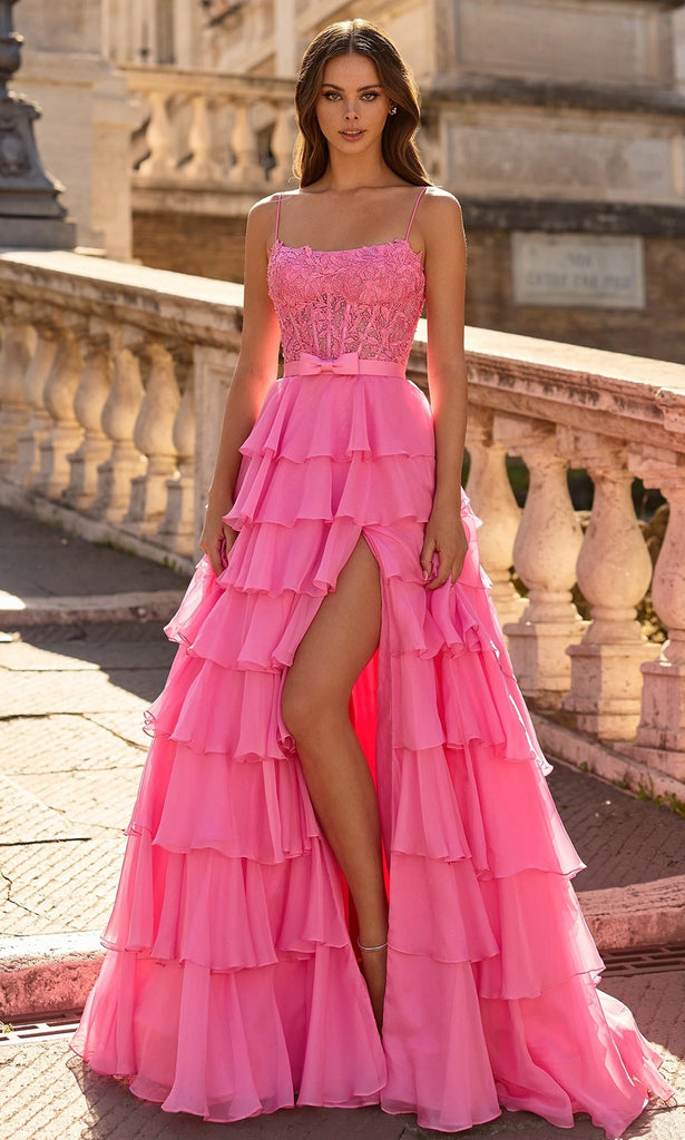 A captivating blend of charm and poise, this Sherri Hill 57922 spaghetti strap gown highlights a lace-embroidered bodice paired with a tiered ruffle skirt. The fitted silhouette emphasizes the waist with a dainty bow waistband, adding sweetness to the design. Soft layers cascade into a full-length hem, giving this ballgown a playful yet elegant touch that draws the eye from every angle. Finished with a daring slit, it offers both sophistication and movement, making it ideal for any gala or special event. Sherri Hill 57922 is the perfect expression of graceful beauty and elevated design. Model is wearing Bright Pink color.