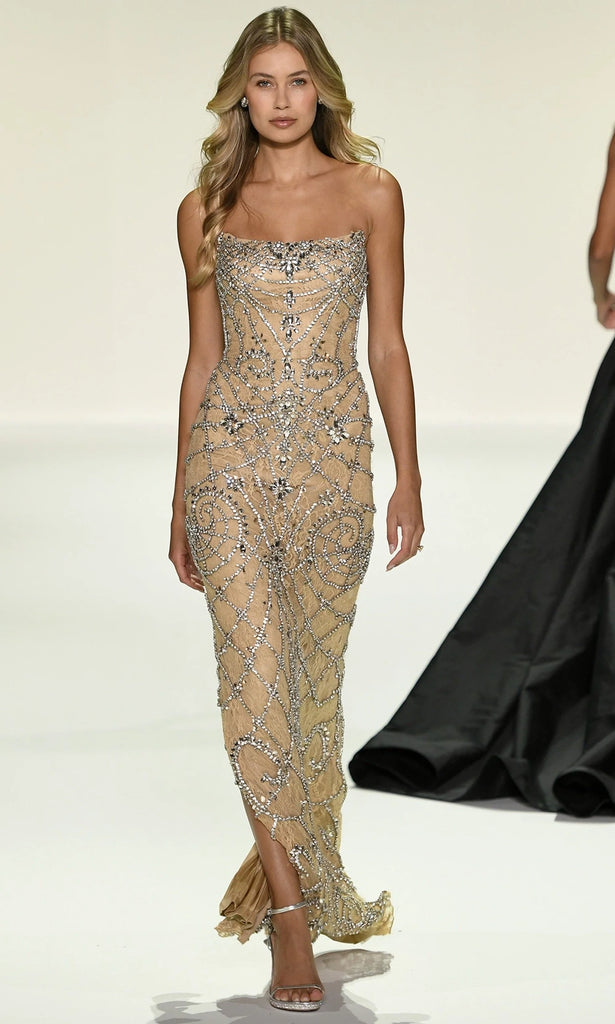 Artistic brilliance radiates through Sherri Hill 67143, where beadwork transforms classic form into modern sculpture. The strapless scoop neckline and fitted column silhouette highlight a refined figure, enhanced by beaded embellishments that shimmer under light. A center back slit ensures ease of movement while maintaining a seamless profile. Each beaded pattern adds dimension, reflecting meticulous attention to detail. Sherri Hill 67143 brings an air of sophistication, making it an unforgettable choice for evenings that celebrate grace and allure. Model is wearing Nude/Silver color.