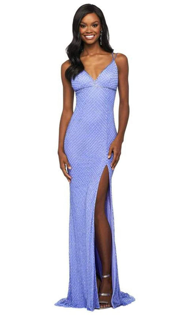 | Details: | Plunging V-Neckline, Dual Straps, Cross Scoop Back, Zipper Closure, Sheath Silhouette, High-Leg Slit, Sweep Train |
