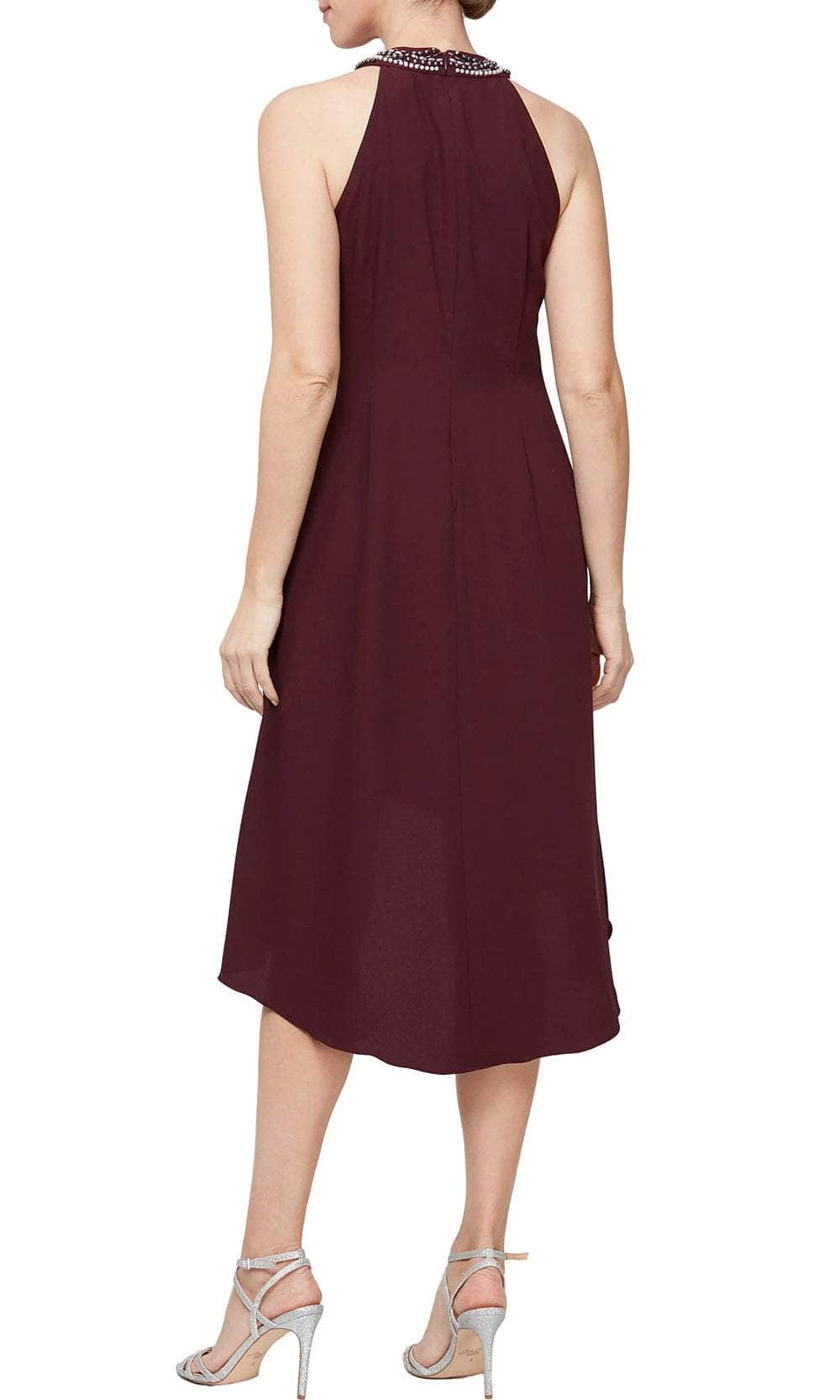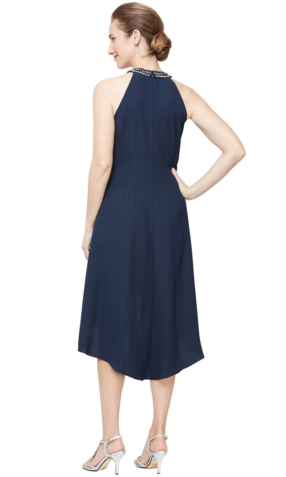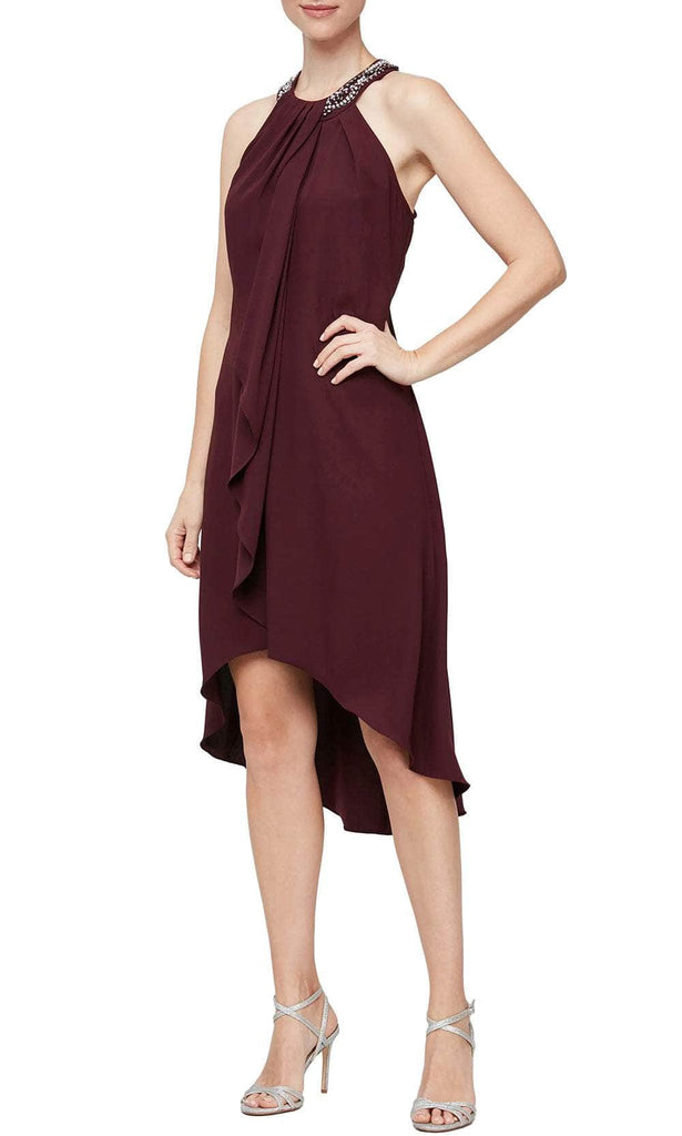 Softly draped with a soft chiffon overlaying a tailored lining, this beauty shows a bead embellished yoke crafting a halter neckline. Donning a ruffle detailing down the front and a racer design at the back, the A-line skirt softly waterfalls into a sexy high low hemline. Models are wearing the Fig and Navy colors.
