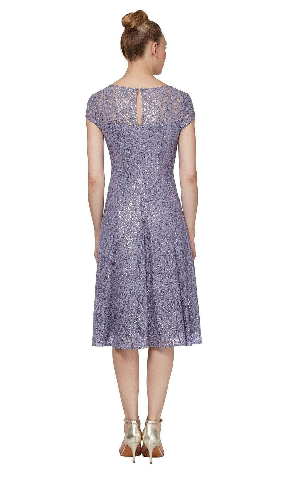 This classy allover lace dress with dash of sequins features an elegant scoop neckline, sheer yoke and short sleeves and a back with keyhole and zipper closure. The bodice is comfortably fitted with seam and from the natural waistline the skirt open in a beautiful A-line silhouette. Model is wearing Mystic Heather color.