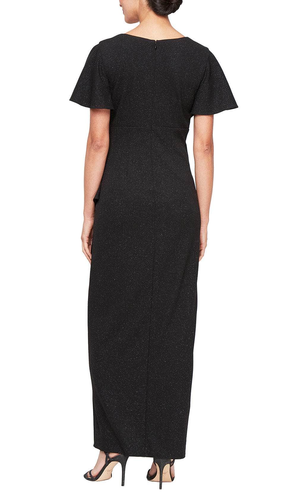 Draw every eye in the room by wearing this minimalist design from S.L. Fashions 9127212. This statement piece showcases a surplice V-neckline and short flutter sleeves that exude graceful femininity, while the sparkling beaded brooch at the side waist and ruching adds a touch of glamour. A concealed zipper closure in the center full back makes the dressing a breeze. The skirt reveals a wrap column silhouette that descends to the full length and exits with a tulip hem. This S.L. Fashions 9127212 dress promises to create an exceptional and unforgettable look. Model is wearing Black color.