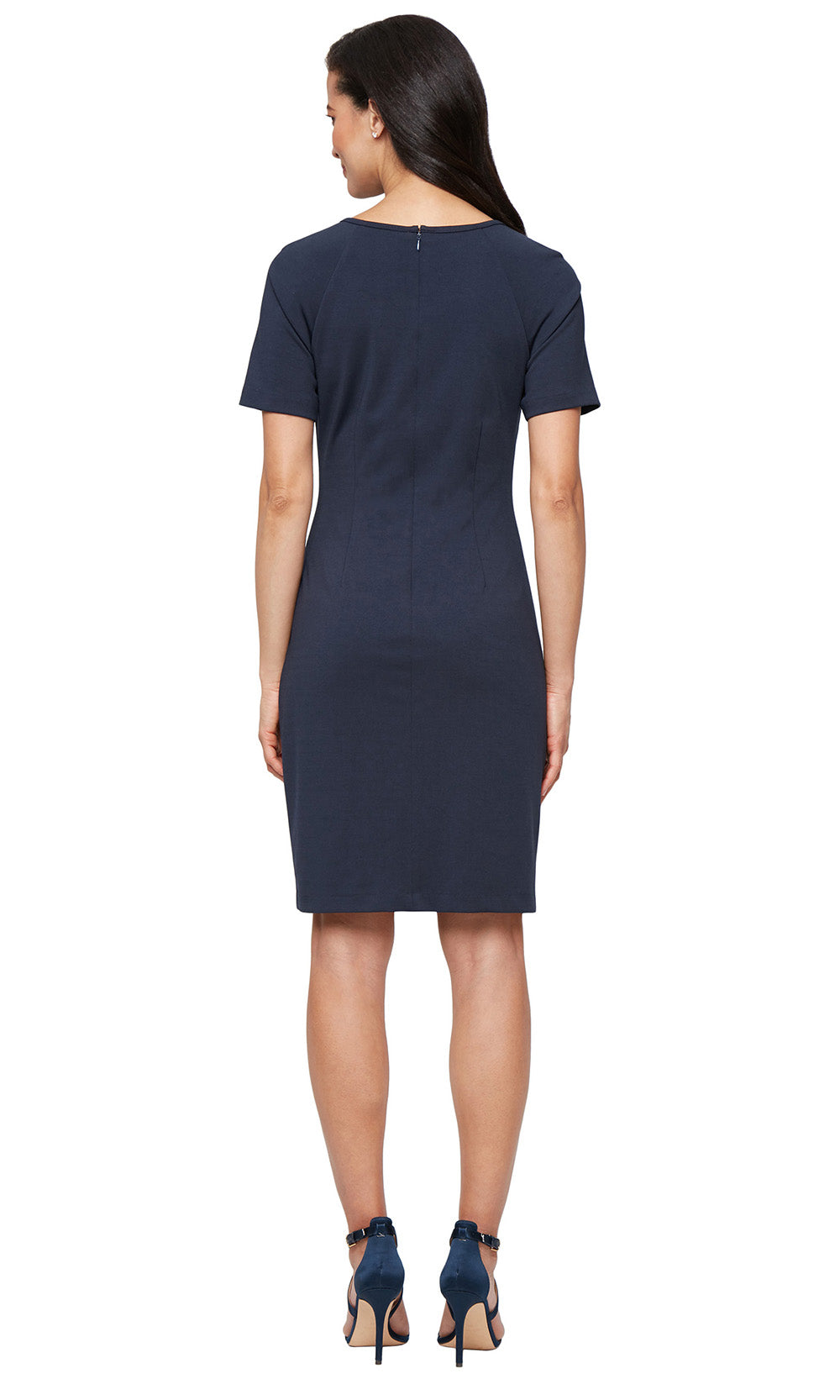Polished and flattering, this S.L. Fashions 9134738 brings together refined tailoring and eye-catching detail. A delicate keyhole at the jewel neckline offers a modern twist while maintaining elegance, and short sleeves make it suitable for a variety of occasions. Ruching at the waist enhances the figure, with a cascading ruffle detail adding movement and visual interest. The knee-length sheath cut balances structure with comfort. This S.L. Fashions 9134738 is an ideal choice for those seeking a versatile piece that can be dressed up or down for events ranging from business dinners to evening receptions. Model is wearing Navy color.