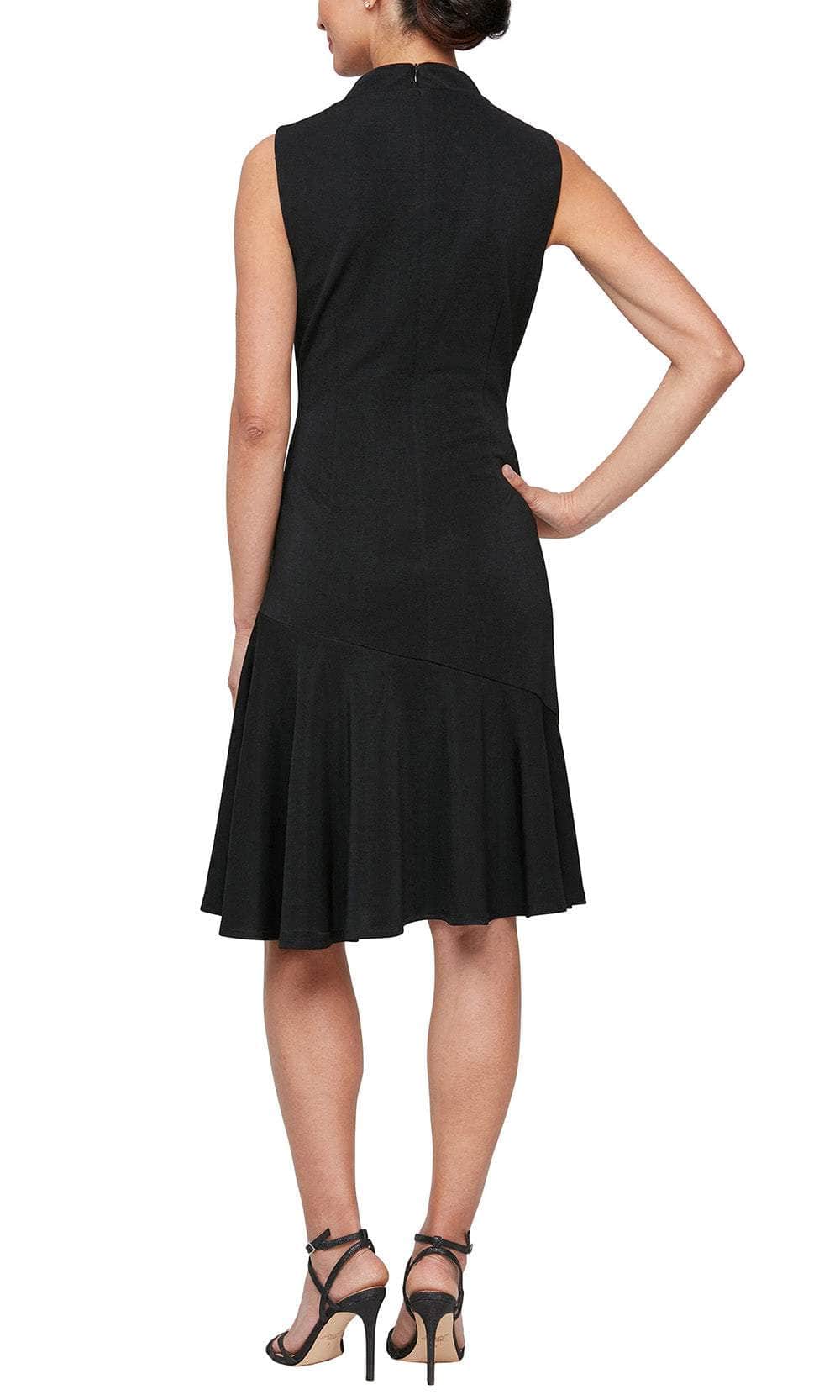 Radiate confidence and grace in the S.L. Fashions 9138101 short dress, a stunning blend of elegance and style. Crafted from luxurious matte jersey fabric, this dress boasts meticulous tailoring lines for a flawless silhouette. The sleeveless bodice features a chic high neckline, exuding modern charm and grace. Completing the ensemble is a full back with a concealed zipper closure, ensuring a seamless finish. The A-line skirt showcases an asymmetrical ruffled hemline, adding a touch of flair and movement to the design. With its below-the-knee length, this dress is perfect for any special occasion, offering timeless sophistication and effortless allure. Elevate your look with S.L. Fashions 9138101. Model is wearing the Black color.