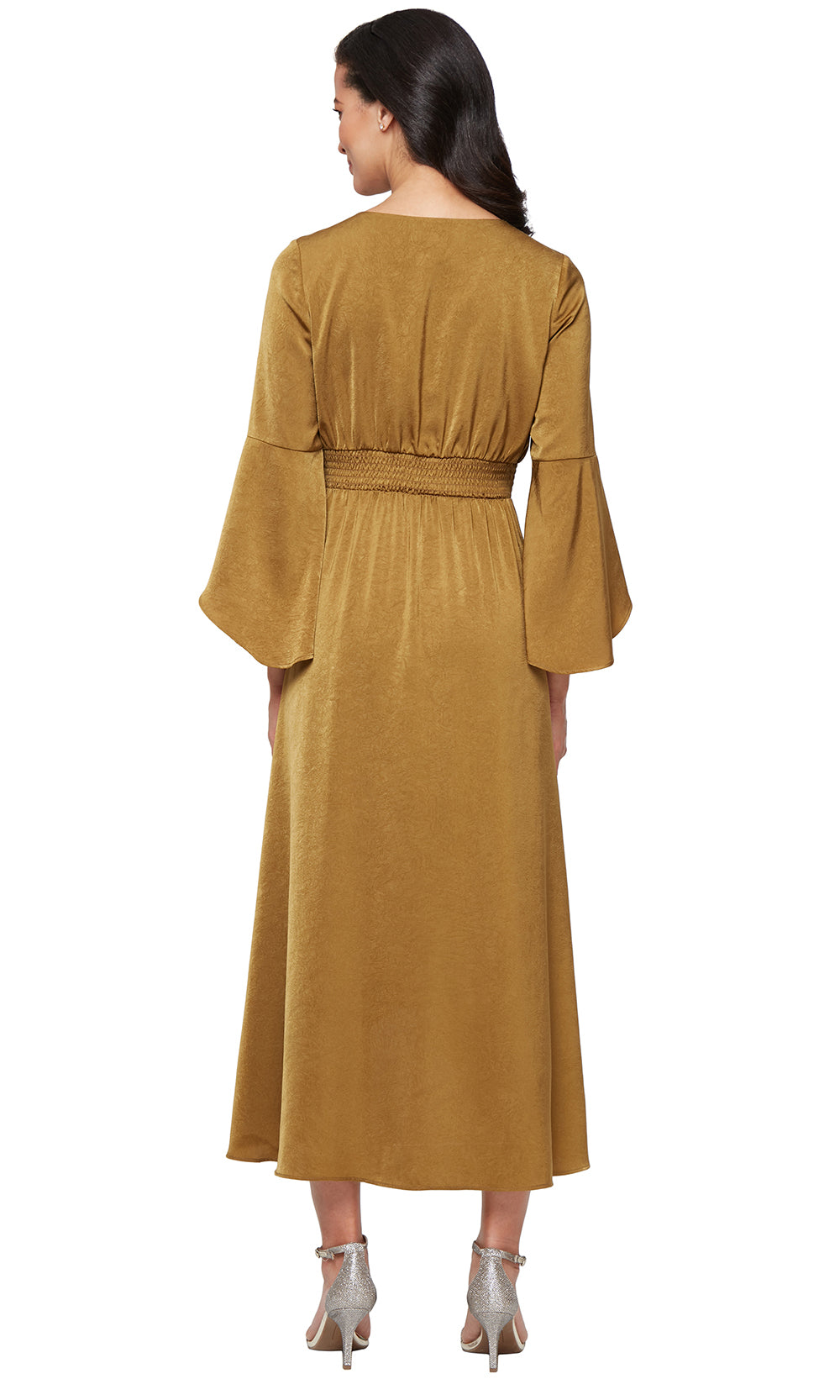 For a modern take on event dressing, the S.L. Fashions 9150131 offers a chic high-low hemline paired with a flattering A-line shape. The surplice v-neckline draws attention to the upper body, while dramatic three-quarter bell sleeves add graceful movement. A ruched waistband highlights the figure before flowing into the asymmetrical skirt, revealing the legs just enough for a playful finish. This S.L. Fashions 9150131 design adapts beautifully to both daytime and evening occasions, making it a versatile and stylish wardrobe addition. Model is wearing Olive color.