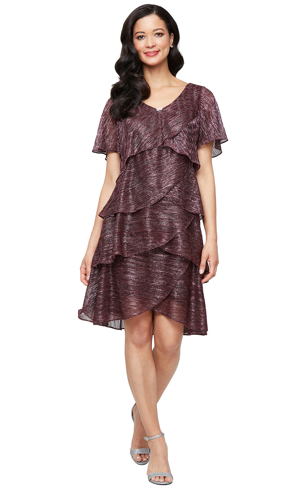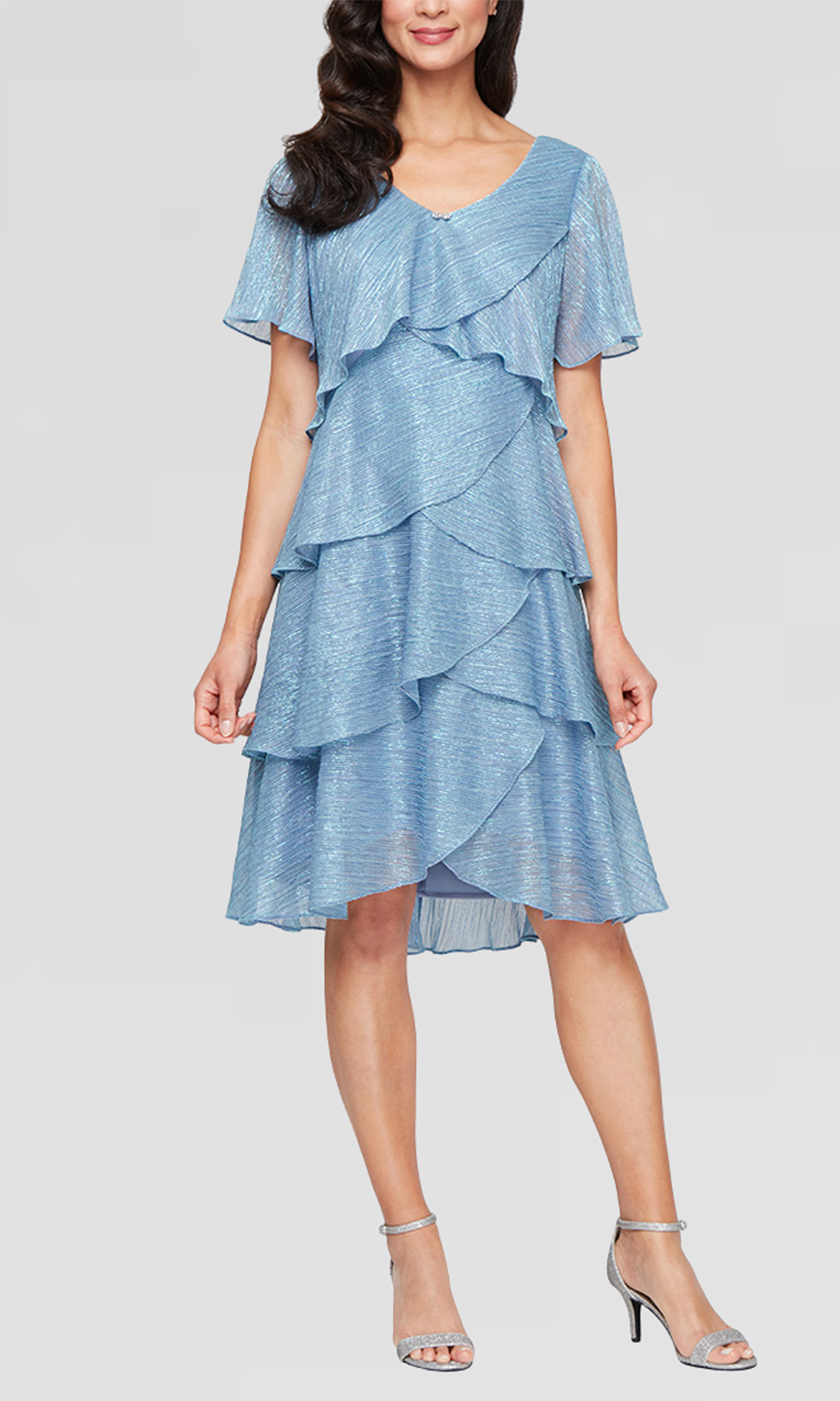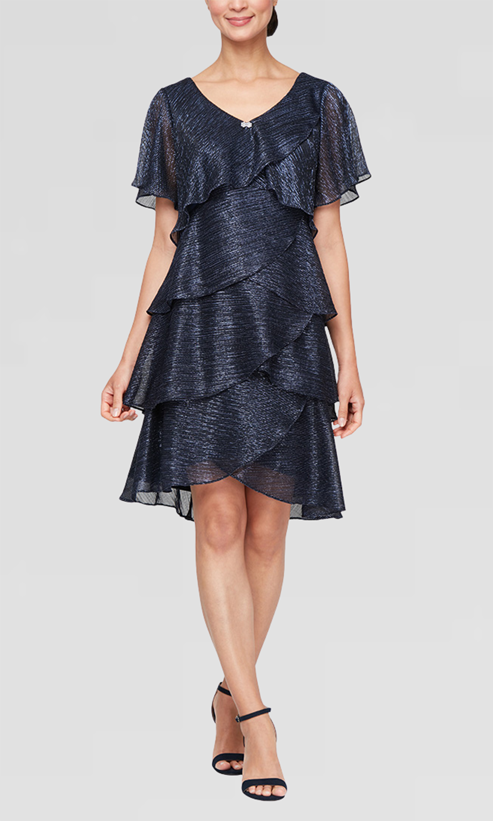 Light and graceful, the S.L. Fashions 9155124 captures movement and shine in every step. Its shimmer bodre chiffon fabric brings a subtle metallic glow that enhances the layered ruffle design. The tiered A-line skirt creates a playful yet polished effect, while short flutter sleeves add a feminine softness to the shoulders and arms. A delicate jewel brooch at the v-neckline provides just the right accent without overpowering the look. The S.L. Fashions 9155124 is the perfect balance of comfort and sophistication for special gatherings where style matters. Models are wearing Berry, Gold, Navy, and Hydrangea colors.