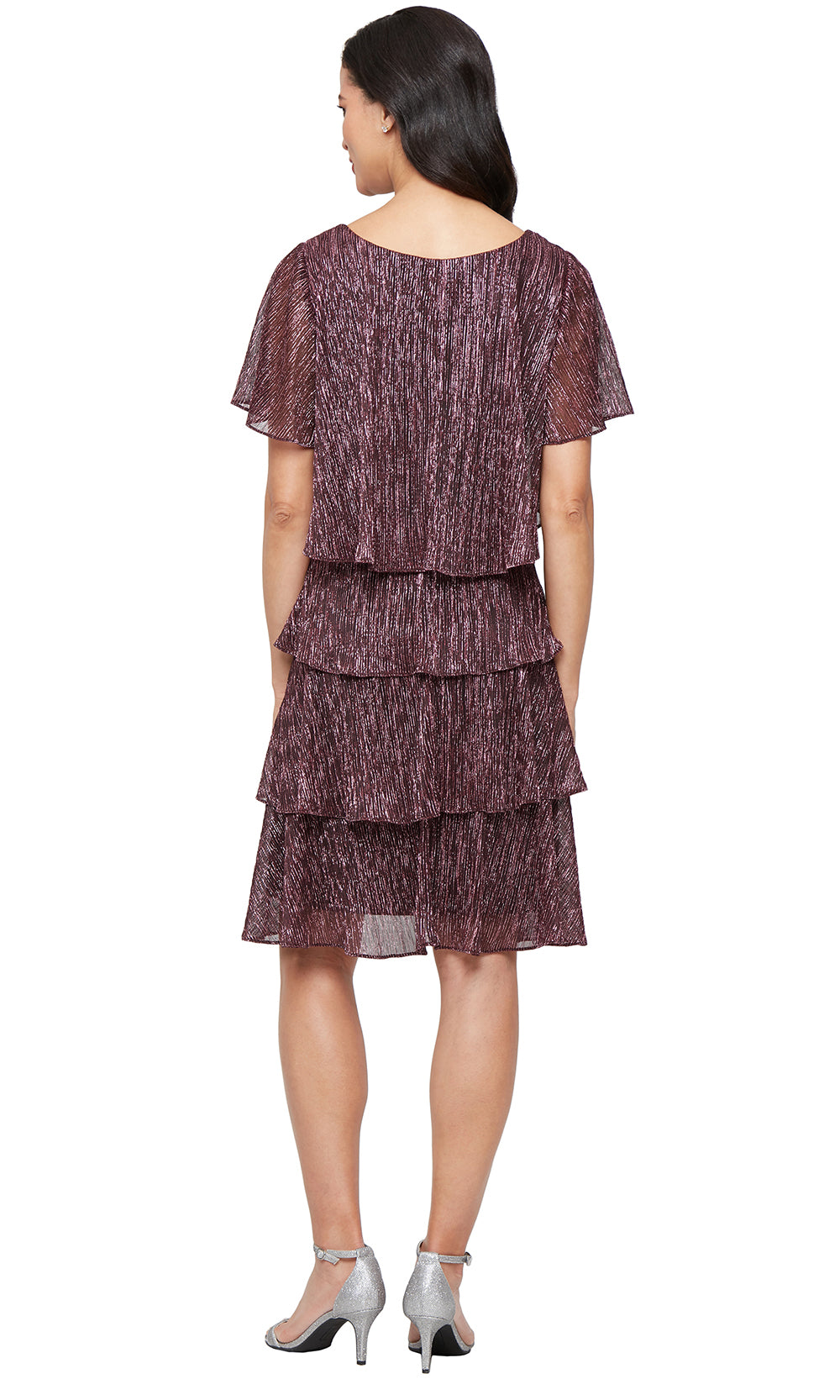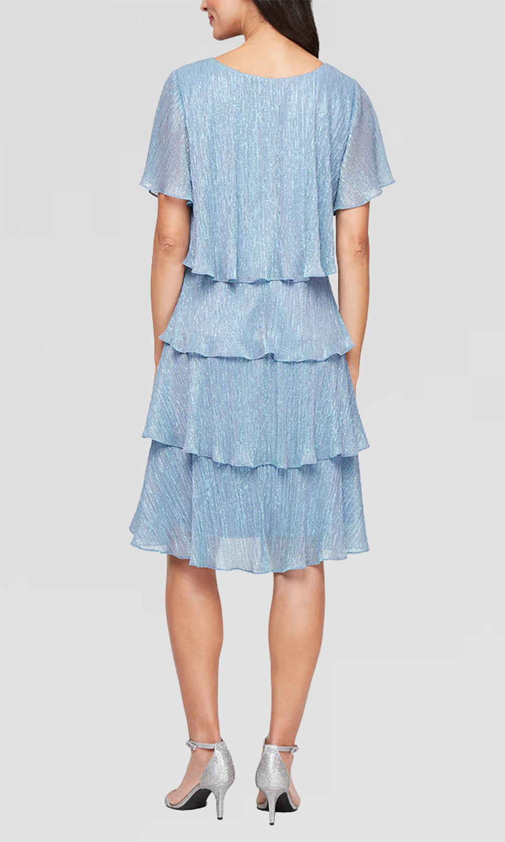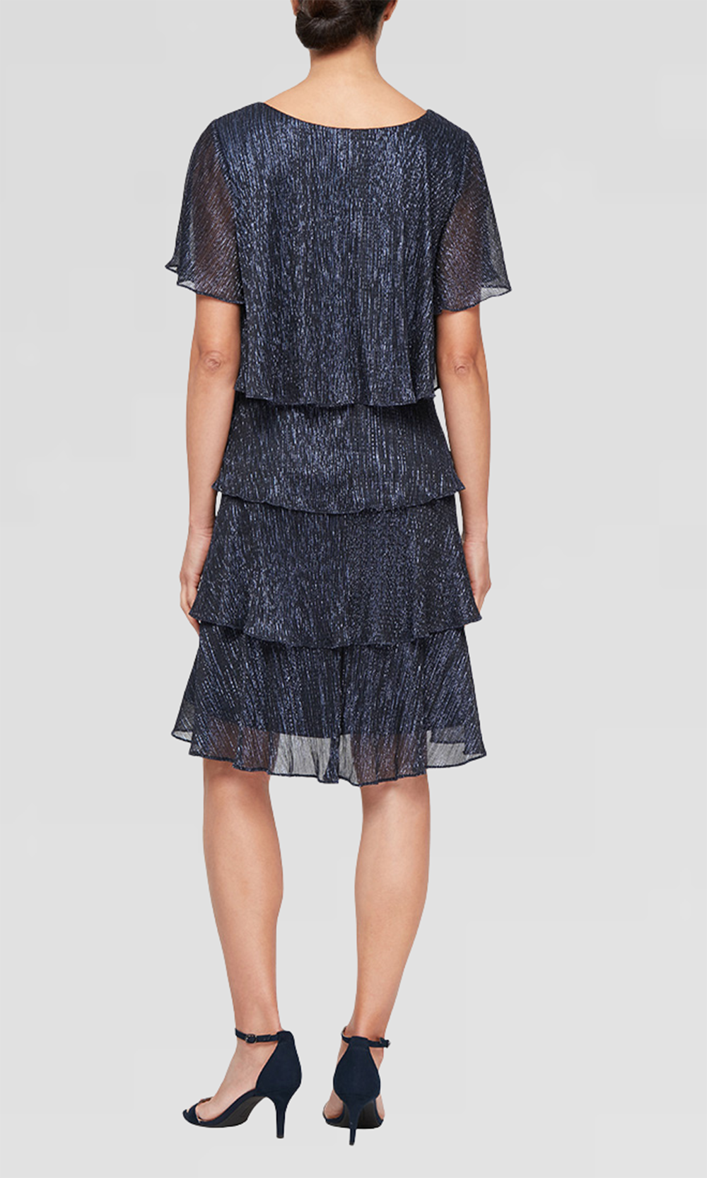 Light and graceful, the S.L. Fashions 9155124 captures movement and shine in every step. Its shimmer bodre chiffon fabric brings a subtle metallic glow that enhances the layered ruffle design. The tiered A-line skirt creates a playful yet polished effect, while short flutter sleeves add a feminine softness to the shoulders and arms. A delicate jewel brooch at the v-neckline provides just the right accent without overpowering the look. The S.L. Fashions 9155124 is the perfect balance of comfort and sophistication for special gatherings where style matters. Models are wearing Berry, Gold, Navy, and Hydrangea colors.
