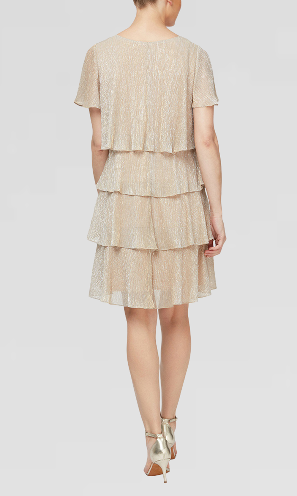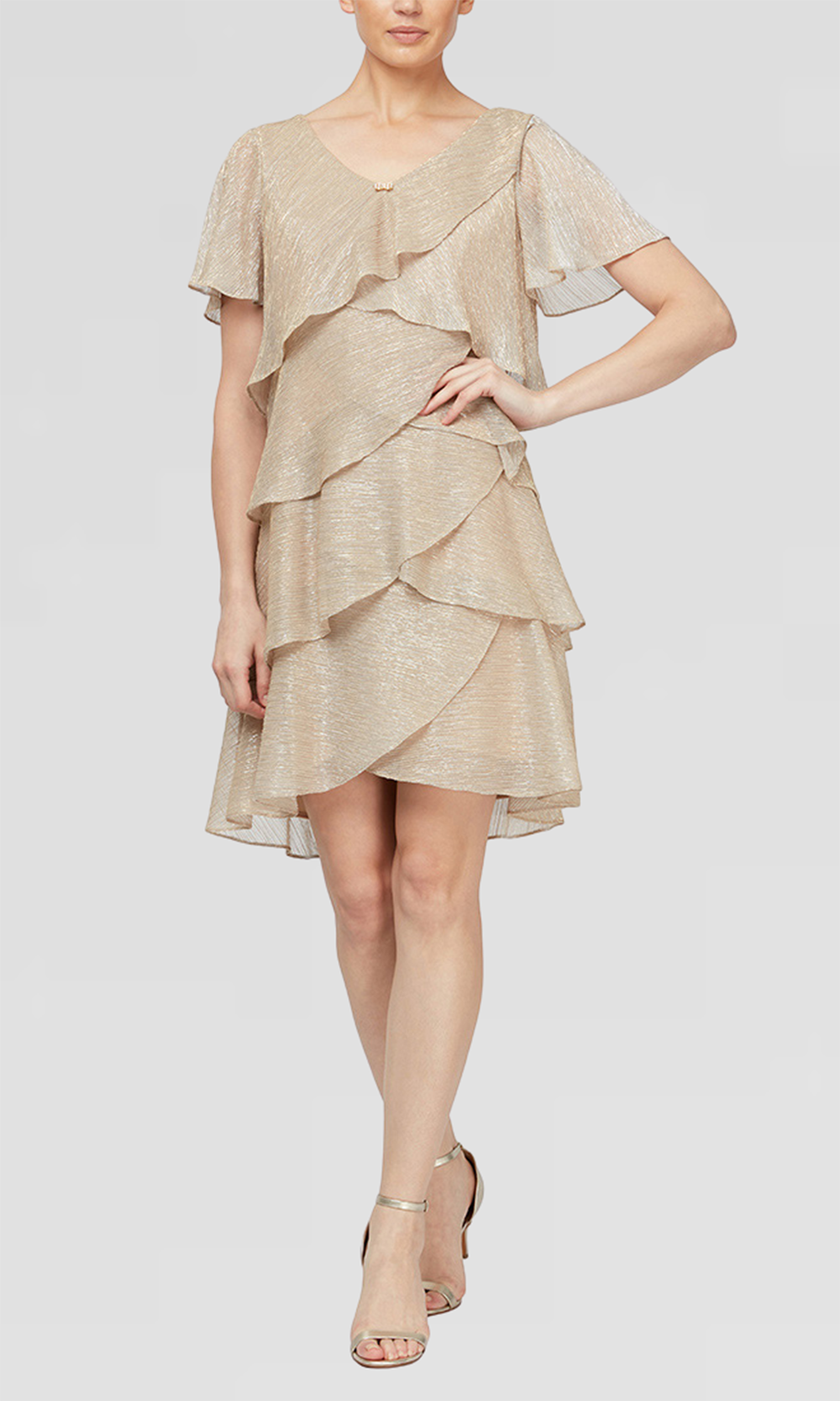 | Details: | Tiered Ruffle Layers, Short Flutter Sleeves, Jewel Brooch, Full Back |