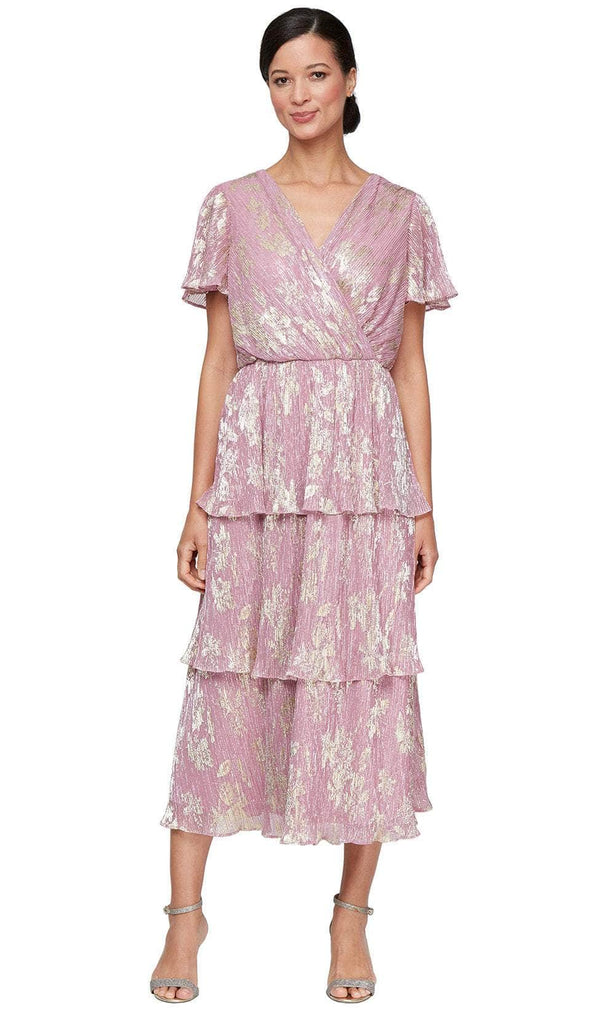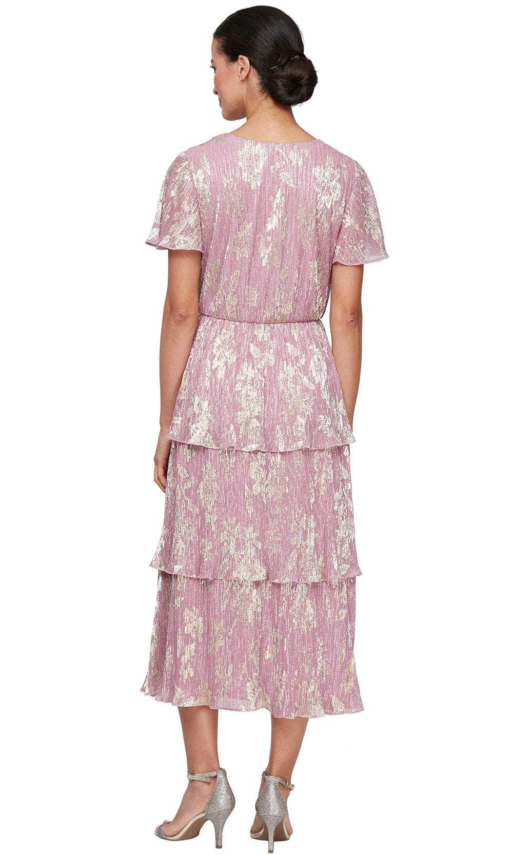 Enrich your special event wardrobe with the S.L. Fashions 9155245 dress, a true blend of elegance and modern flair. This design features a foil printed fabric, short flutter Sleeves, and a flattering surplice design on the V-neckline. The wrapped bodice complements the tiered tea-length skirt, offering graceful movement and texture. The natural waistline and A-line silhouette create a universally flattering look. Celebrate your next occasion in timeless style with the S.L. Fashions 9155245 masterpiece. Model is wearing Blush color.