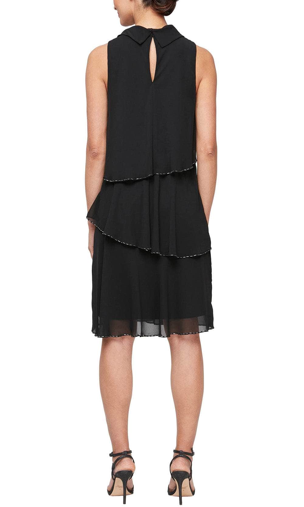 Experience the charm of femininity with the captivating S.L. Fashions 9170728 dress, a classic garment crafted to enchant. Made from chiffon with a tailored inner lining, this dress emanates elegance and poise. The tie-strap high neckline introduces a hint of stylish sophistication, while the tiered design adorned with beaded trims elevates the outfit to a new level of allure. Featuring a cutout full back secured with a hook and eye closure, this dress adds a touch of allure, ensuring all eyes are drawn to you. Finished with a knee-length hem, this dress is suitable for any special occasion. Shine with confidence and allure in the S.L. Fashions 9170728 dress, embodying timeless elegance at its finest. Model is wearing the Black color.