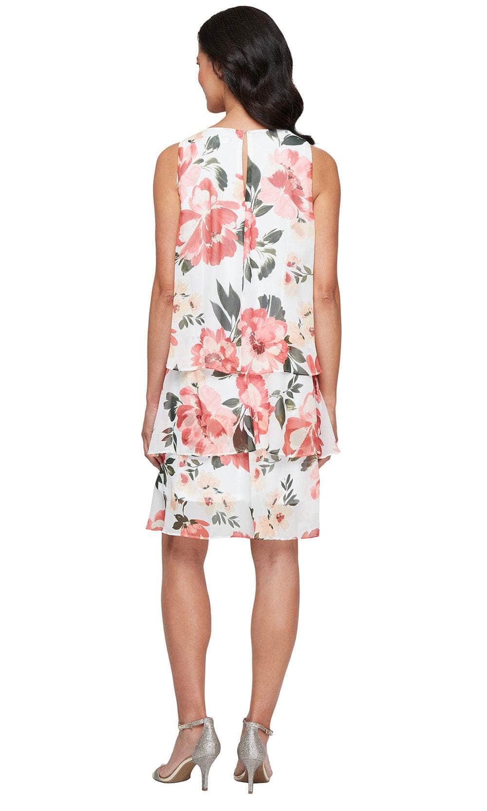 Exude a modern yet romantic flair with S.L. Fashions 9172106, a sleeveless chiffon dress enhanced by a striking artichoke tiers bodice and scoop neckline. The asymmetrical hemline and vibrant floral pattern bring contemporary elegance to this A-line silhouette. Softly draping fabric offers both comfort and sophistication, making this design a standout choice for any fashionable gathering. Experience the effortless grace and refined finish of S.L. Fashions 9172106 as it flows beautifully with every step. Model is wearing Peach Multi color.