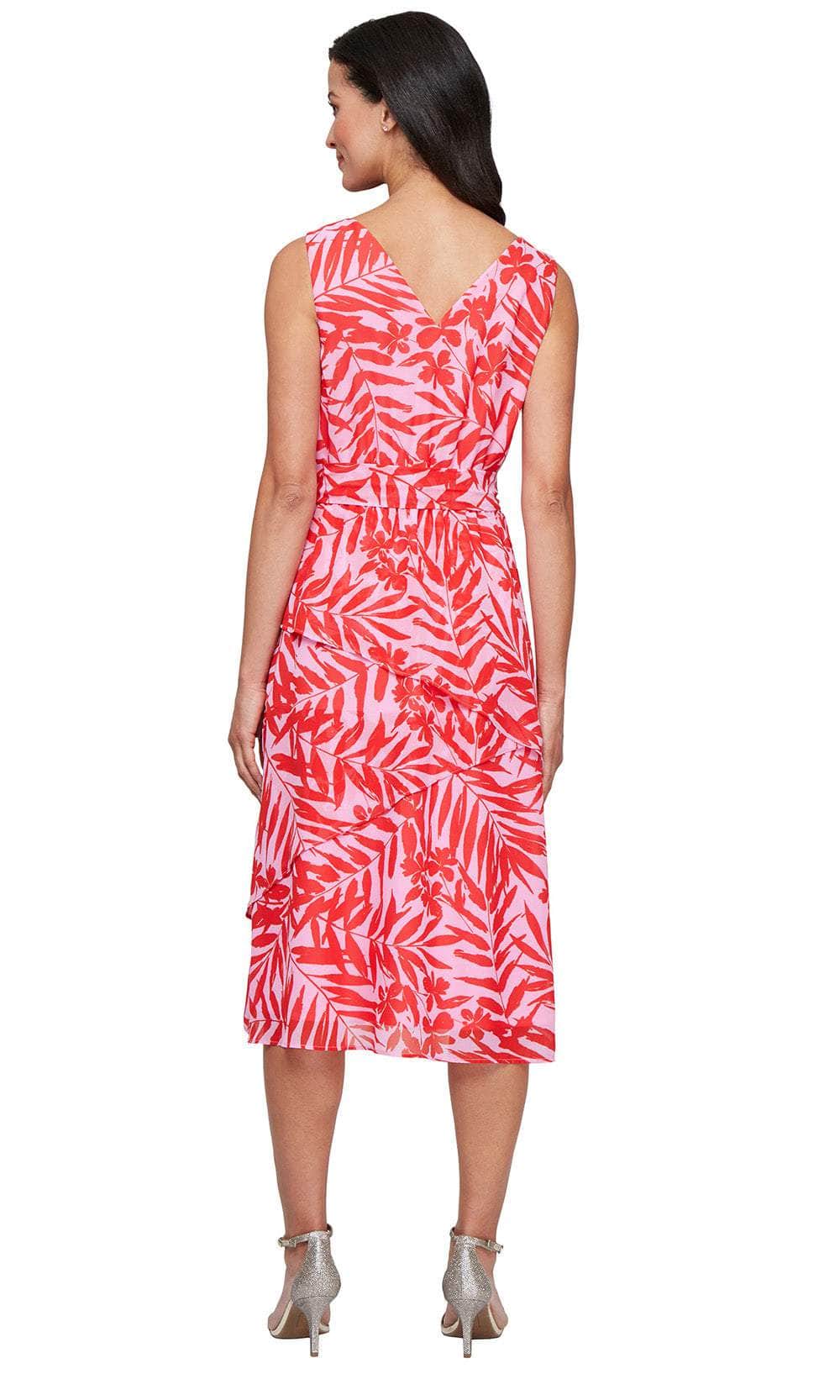 Fresh and playful, S.L. Fashions 9172109 dress exudes a lighthearted charm for daytime or garden parties. The sleeveless bodice with a V-neckline and wide shoulder straps offers a flattering touch, while the natural waist is cinched with a self-tie belt for a feminine silhouette. Crafted from flowing chiffon, the A-line dress features a tiered skirt that sways beautifully with every step. The vibrant leaf and floral pattern adds an uplifting element, creating an ensemble that feels equally timeless and contemporary. Enjoy a charming and versatile piece with S.L. Fashions 9172109. Model is wearing Pink Multi color.