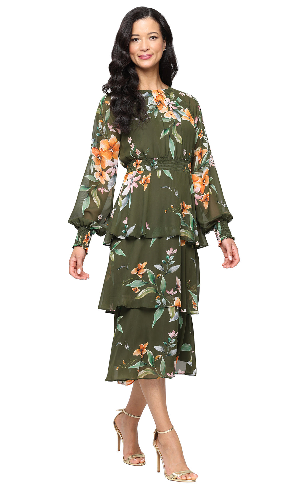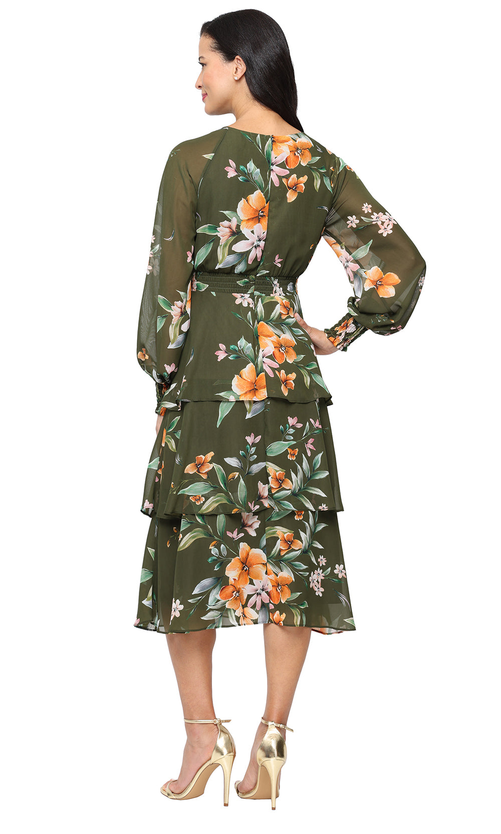 Embrace a fresh, feminine glow with every step in this S.L. Fashions 9172166 style. The dress makes a refined statement with its long bishop sleeves and softly structured silhouette. An elastic waistband balances the flow of the tiered tea-length skirt, while the jewel neckline adds a polished finishing touch. Accentuated by a vibrant floral pattern, this design exudes charm with its gently gathered details and lightly flared hem. Whether you are attending an outdoor luncheon or simply want to feel put together, S.L. Fashions 9172166 offers timeless grace with a comfortable and flattering fit. Model is wearing Olive Multi color.