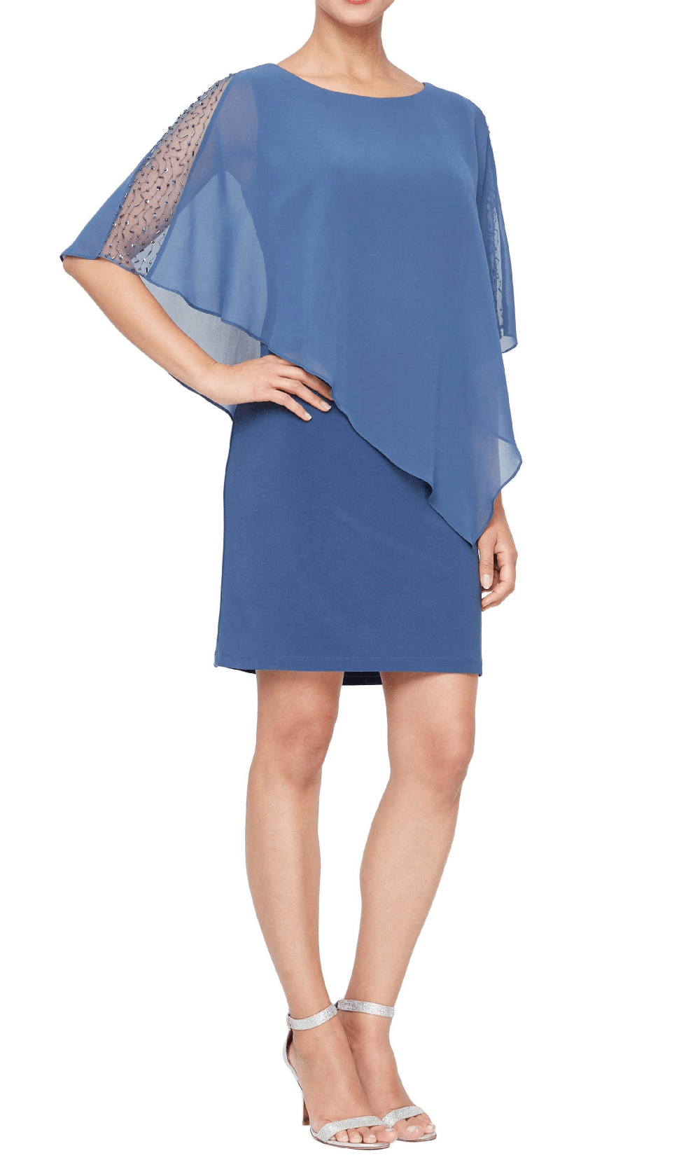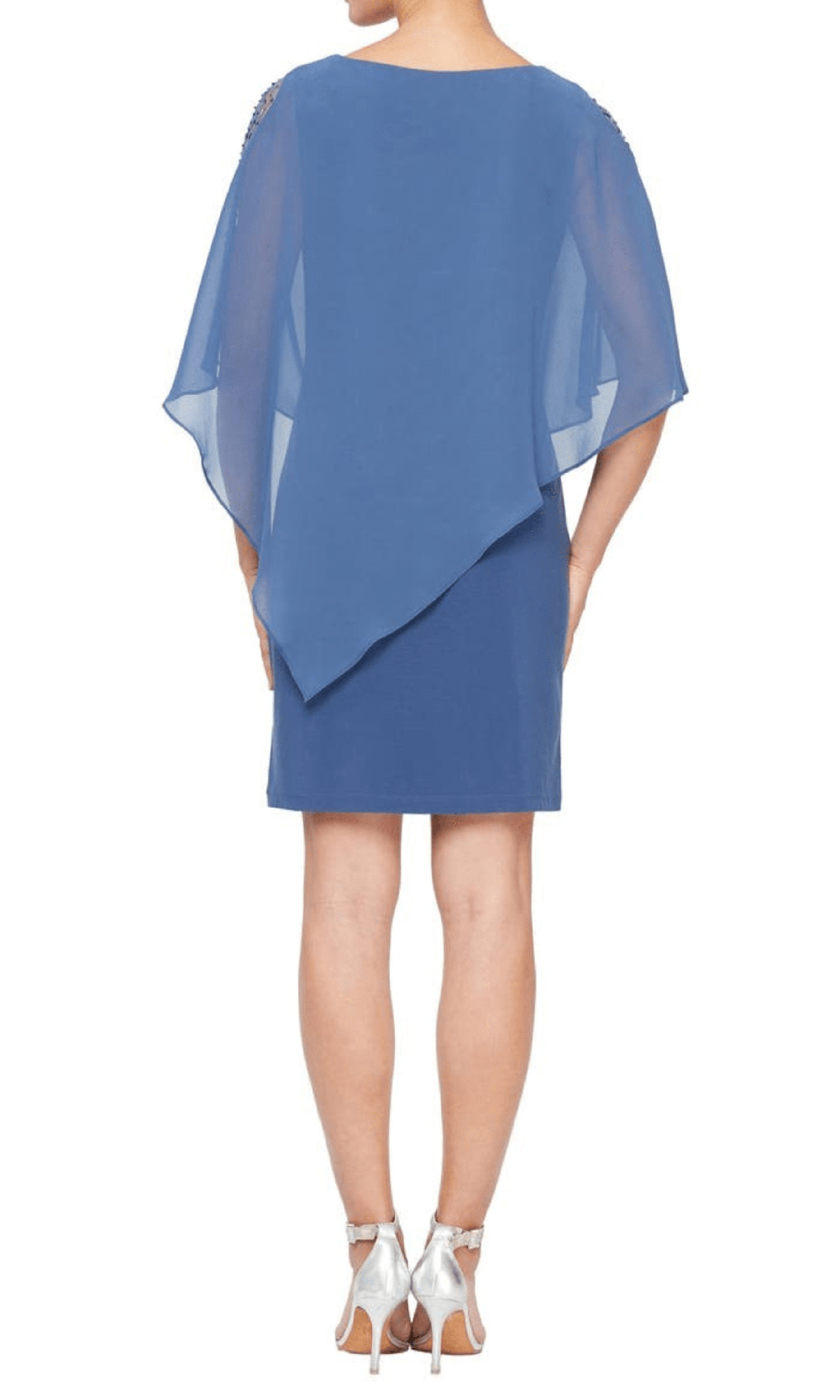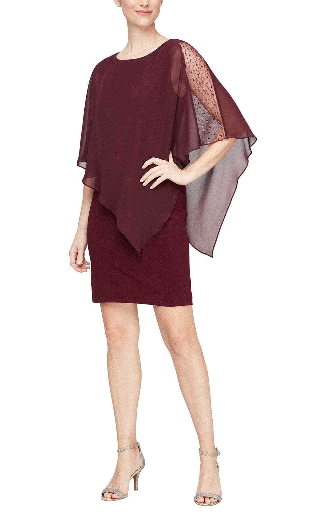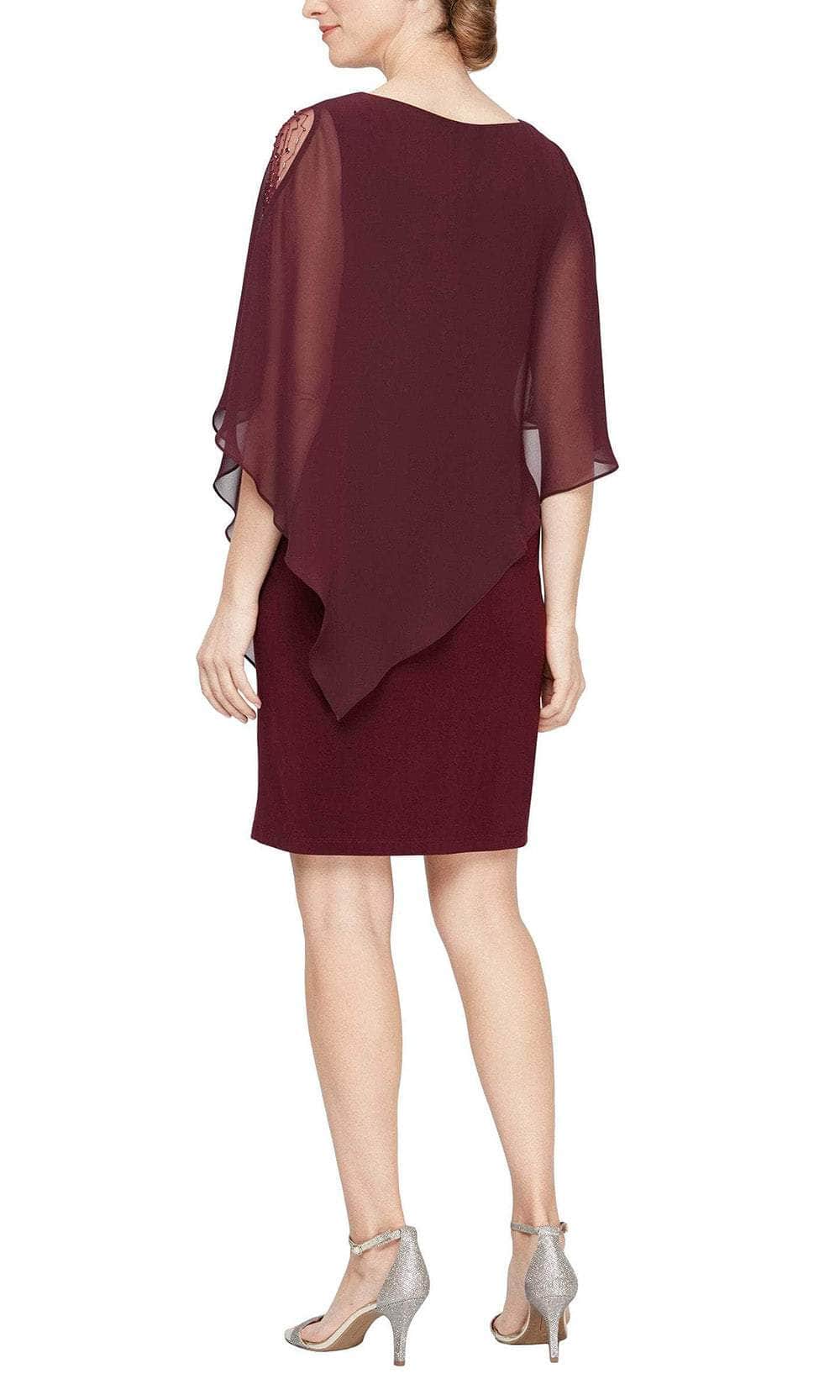 Reveal your inner goddess with the S.L. Fashions 9177437 cocktail dress, an enchanting ensemble crafted to mesmerize. Featuring a chiffon capelet overlay adorned with a beaded panel, this dress emanates elegance with every motion. The scoop neckline brings a hint of allure, while the full back, secured by a concealed zipper closure, ensures a flawless fit. The sheath skirt drapes effortlesS.L.y, enhancing your curves and culminating in a short hemline, infusing a playful charm into your appearance. Ideal for any special event, this dress guarantees to capture attention and leave a lasting impression. Elevate your fashion with the S.L. Fashions 9177437 cocktail dress. Models are wearing the Black, Fig, and Wedgewood colors.