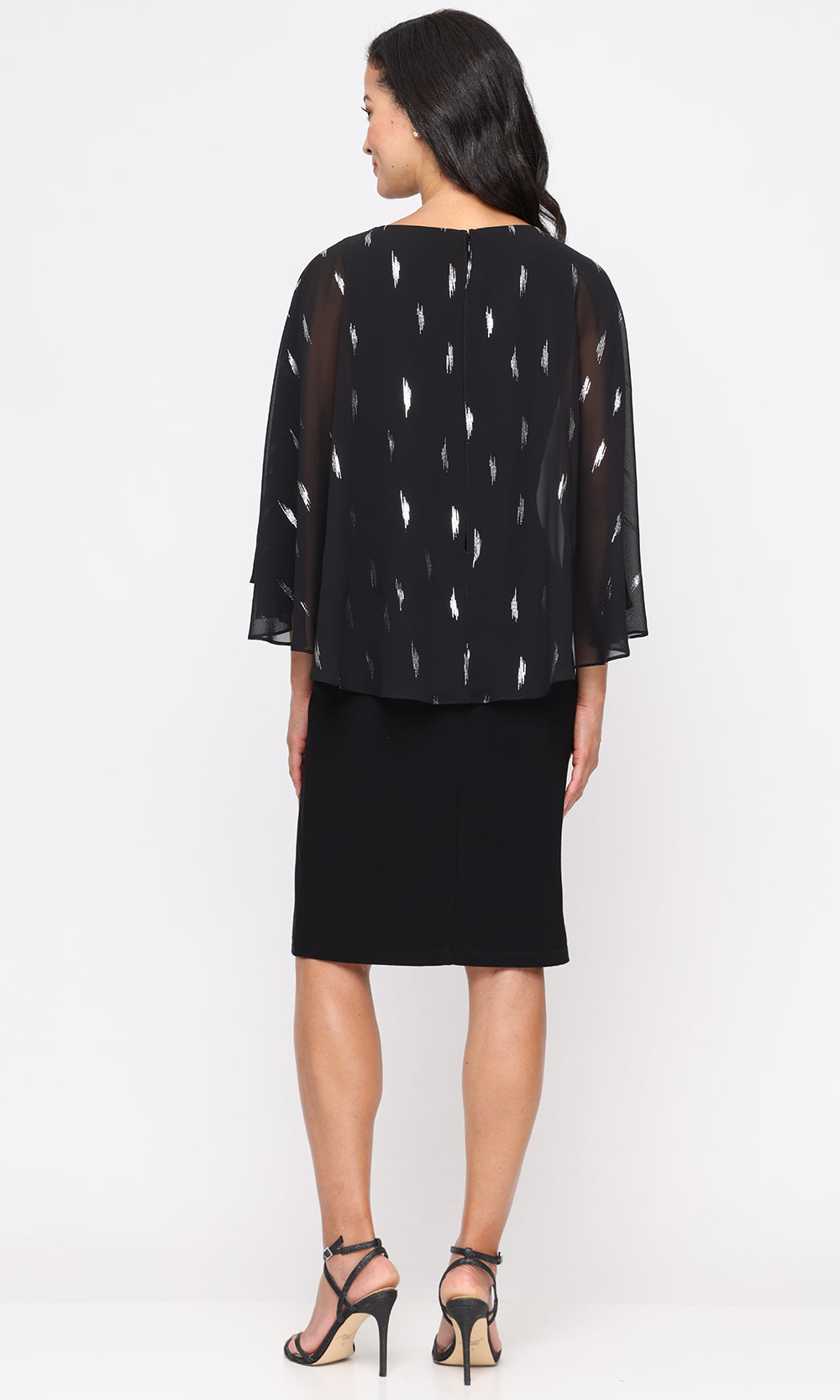Minimal effort with maximum impact defines this S.L. Fashions 9179502 standout piece. A printed capelet overlay floats gracefully atop a sleek sheath base, creating a silhouette that gently contours the figure. It features a scoop neckline paired with modest full back design. Its knee-length hem offer timeless elegance that transitions effortlessly from daytime to evening. Whether celebrating or mingling, S.L. Fashions 9179502 is a versatile statement-maker that is both flattering and distinctive. Model is wearing Blk Sil color.