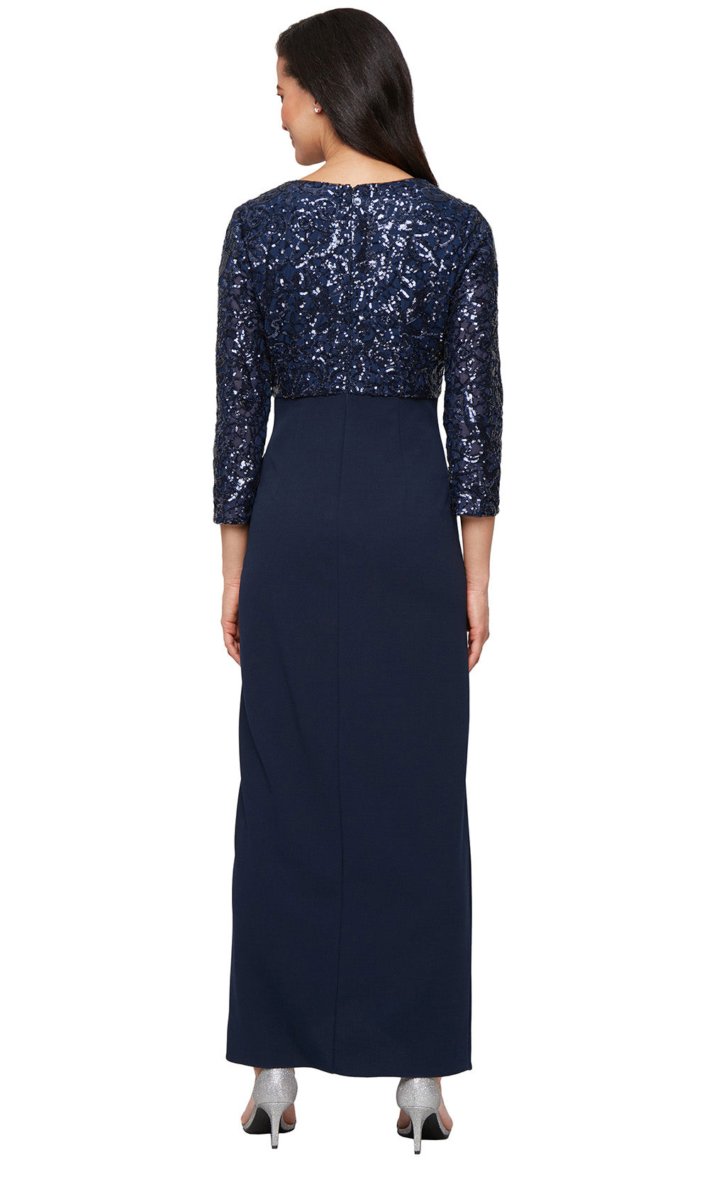 All eyes will be drawn your way the moment you arrive in this S.L. Fashions 9196489 style. The gown showcases three-quarter sleeves and sparkling embellishment, adding texture and dimension above a gathered wrap-style skirt. The V-neckline enhances the decolletage while the defined empire waist brings balance to the column silhouette. With a layered wrap detail that adds softness and structure, this full-length gown is perfect for an occasion where elegance is key. Step into the polished design of S.L. Fashions 9196489 and enjoy confidence with every step. Model is wearing Navy color.