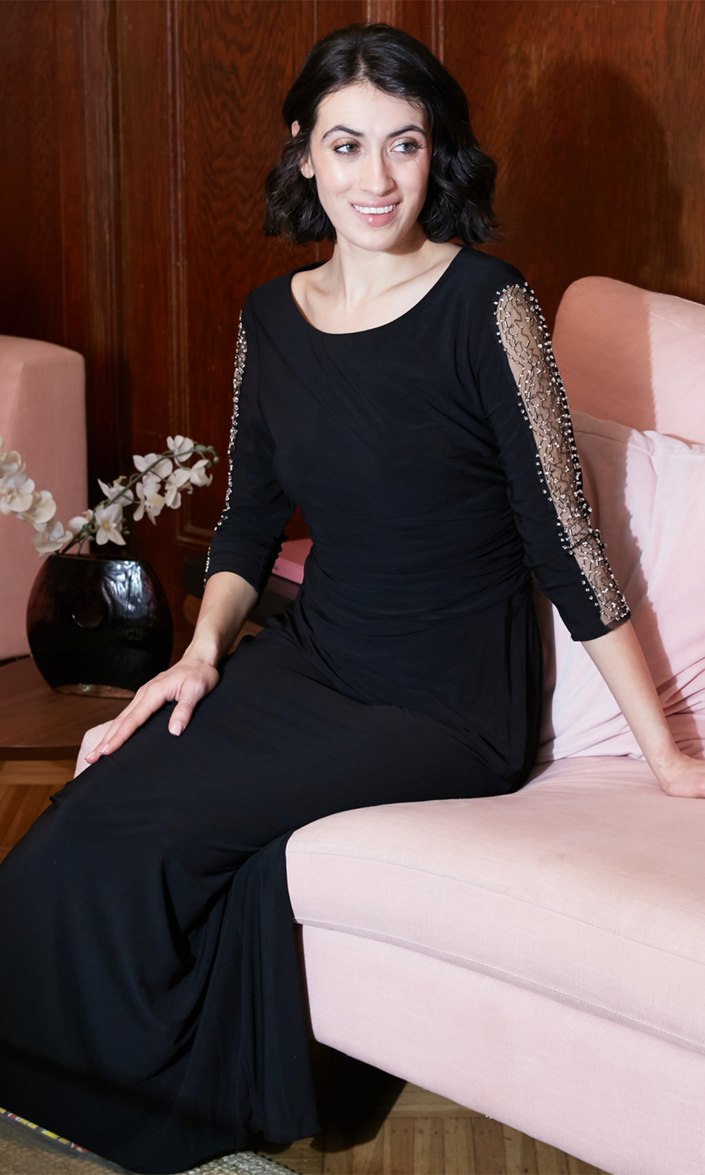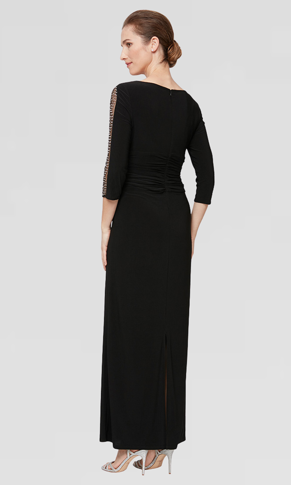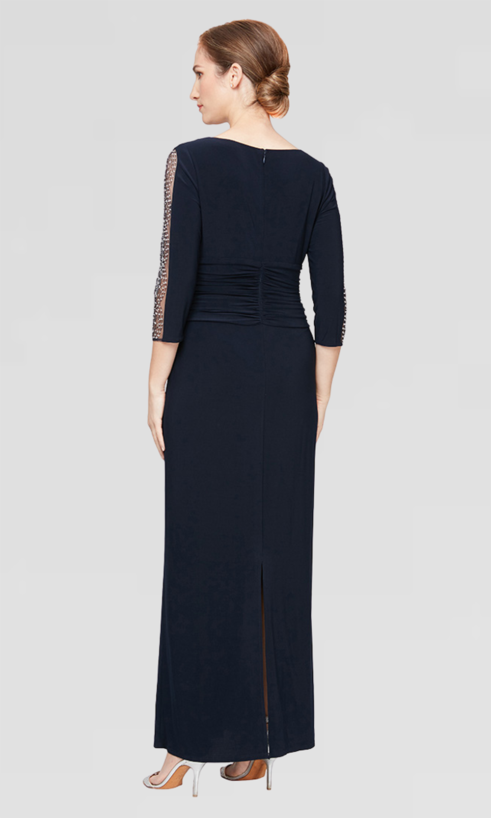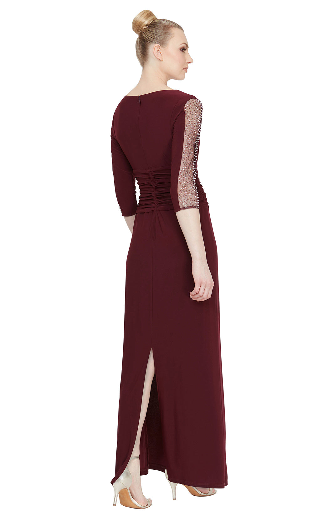 | Details: | Three-Quarter Sleeves, Beaded Sheer Panels, Center Back Slit, Ruched Waistband |