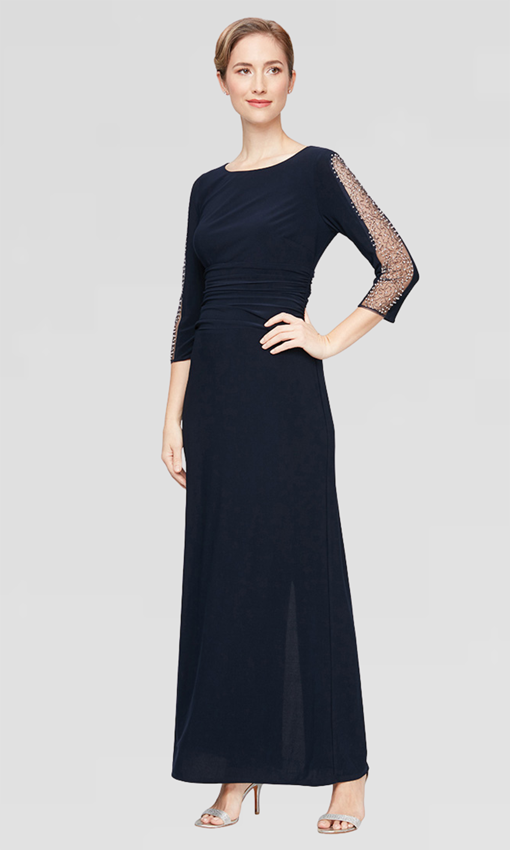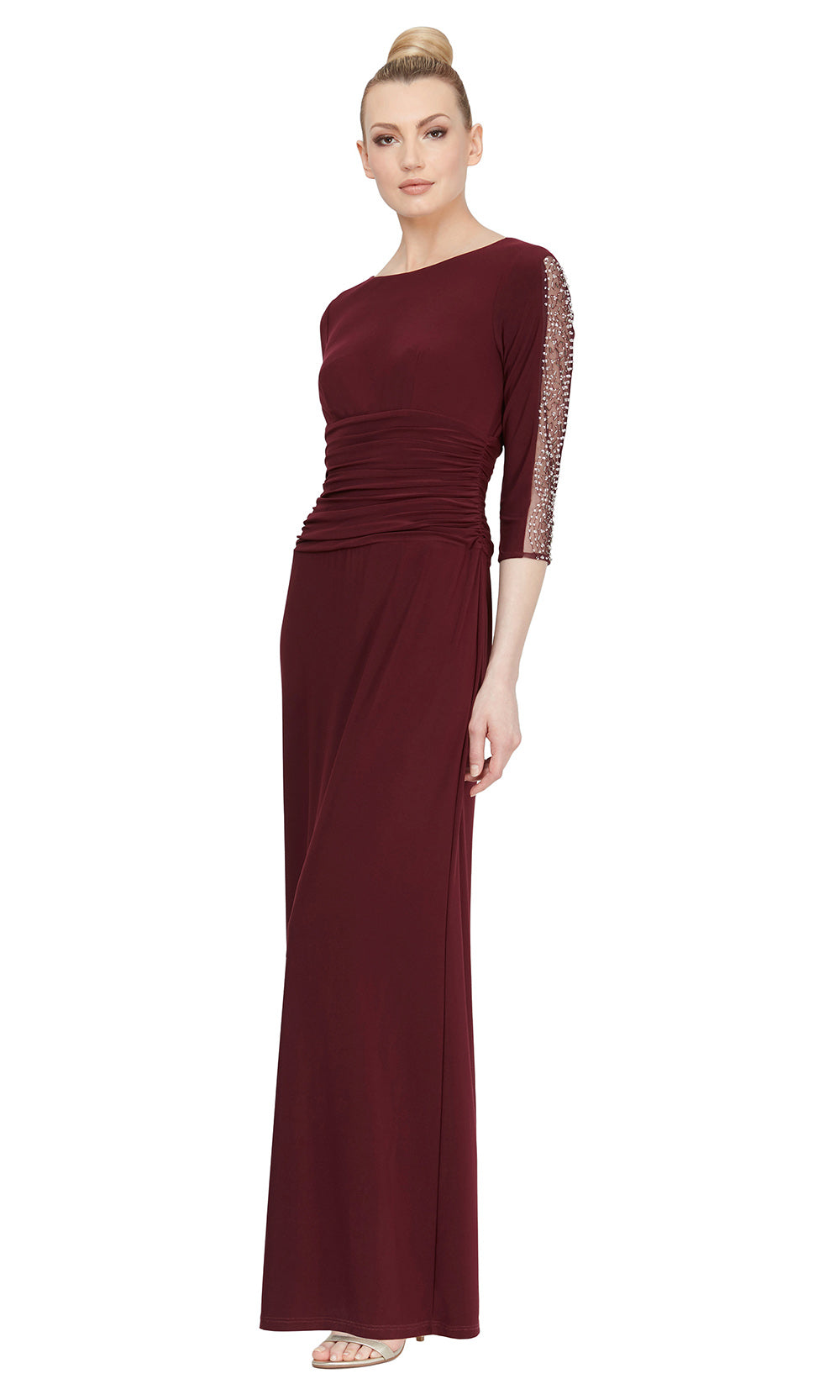 Understated glamour defines the S.L. Fashions 9235172, making it a versatile choice for sophisticated evenings. Made in soft matte jersey, the gown offers a smooth and flattering fit that enhances natural curves. A ruched design adds definition at the waist, while the sheer panel at the sleeves sparkle with carefully placed beaded embellishments. Three-quarter sleeves strike a balance between coverage and style, creating a refined finish. With its scoop neckline and streamlined column silhouette, the S.L. Fashions 9235172 is well-suited for occasions where grace and comfort are equally important. Models are wearing Black, Fig, and Navy colors.
