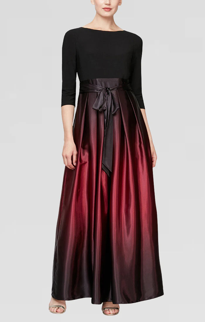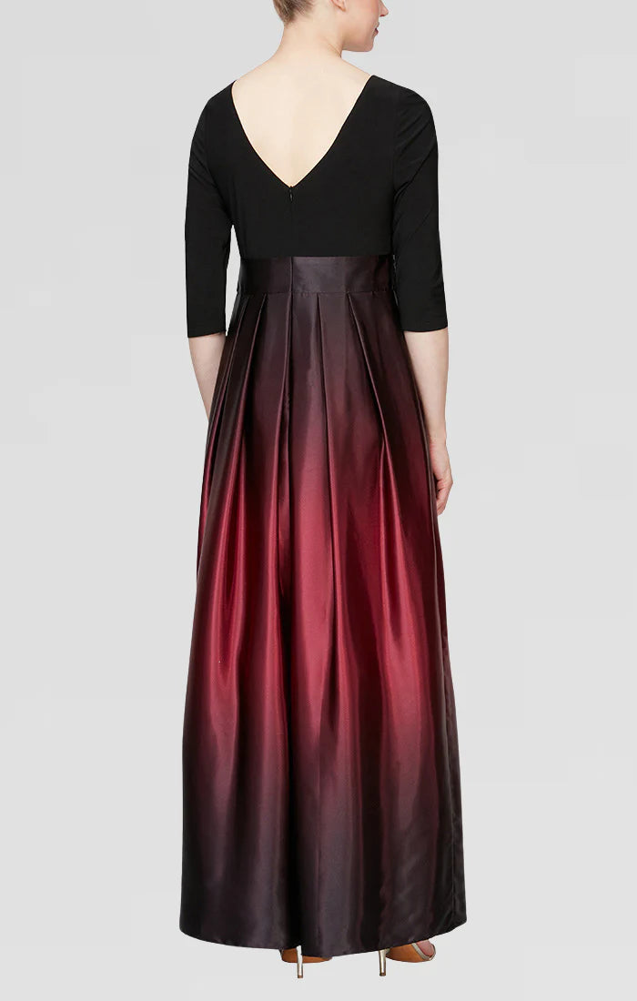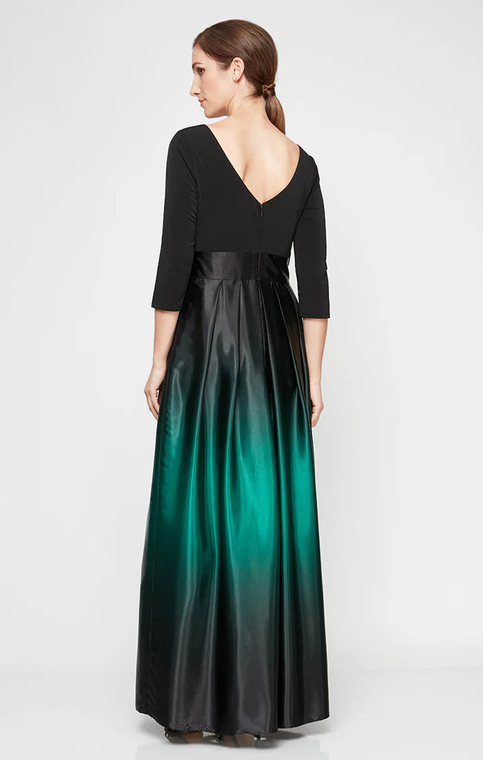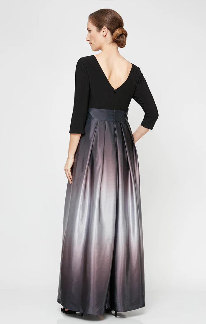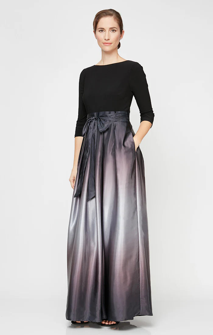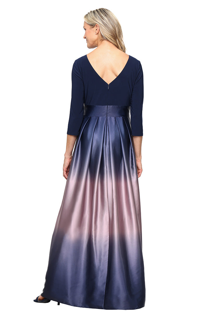Make a statement at your party in the S.L. Fashions 9251111 dress. This elegant piece features an ombre charmeuse skirt and a fitted bodice with quarter sleeves and a jewel neckline. The plunging v-open back adds a touch of sophistication, while the waist is nipped in with a bow accent. Complete with side pockets and a back zipper closure, this full-length dress is specially designed to flatter petite sizes. Be a definite stunner in this S.L. Fashions 9251111 design. Dress is picture in Navy/Mauve, Blk/Green, Blk/Silver, Fig, and Navy/Wedgewood colors.
