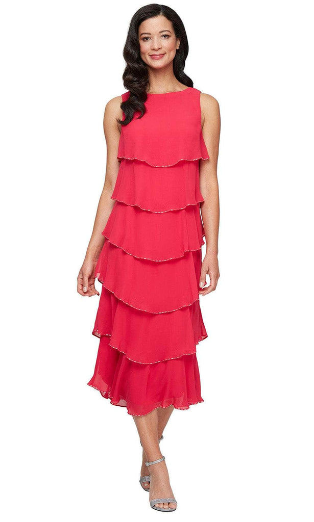Embrace graceful movement with S.L. Fashions 9270734 creation. This sleeveless A-line dress is crafted from airy chiffon and features cascading tiered layers, each highlighted by subtle hand-beaded trim that sparkles with every movement. The bateau neckline adds a soft touch, and the tea-length hemline offers a modern yet sophisticated profile. Ideal for daytime celebrations or evening parties, this dress blends effortless beauty with delightful texture. S.L. Fashions 9270734 embodies playful charm and flowing elegance. Model is wearing Watermelon color.