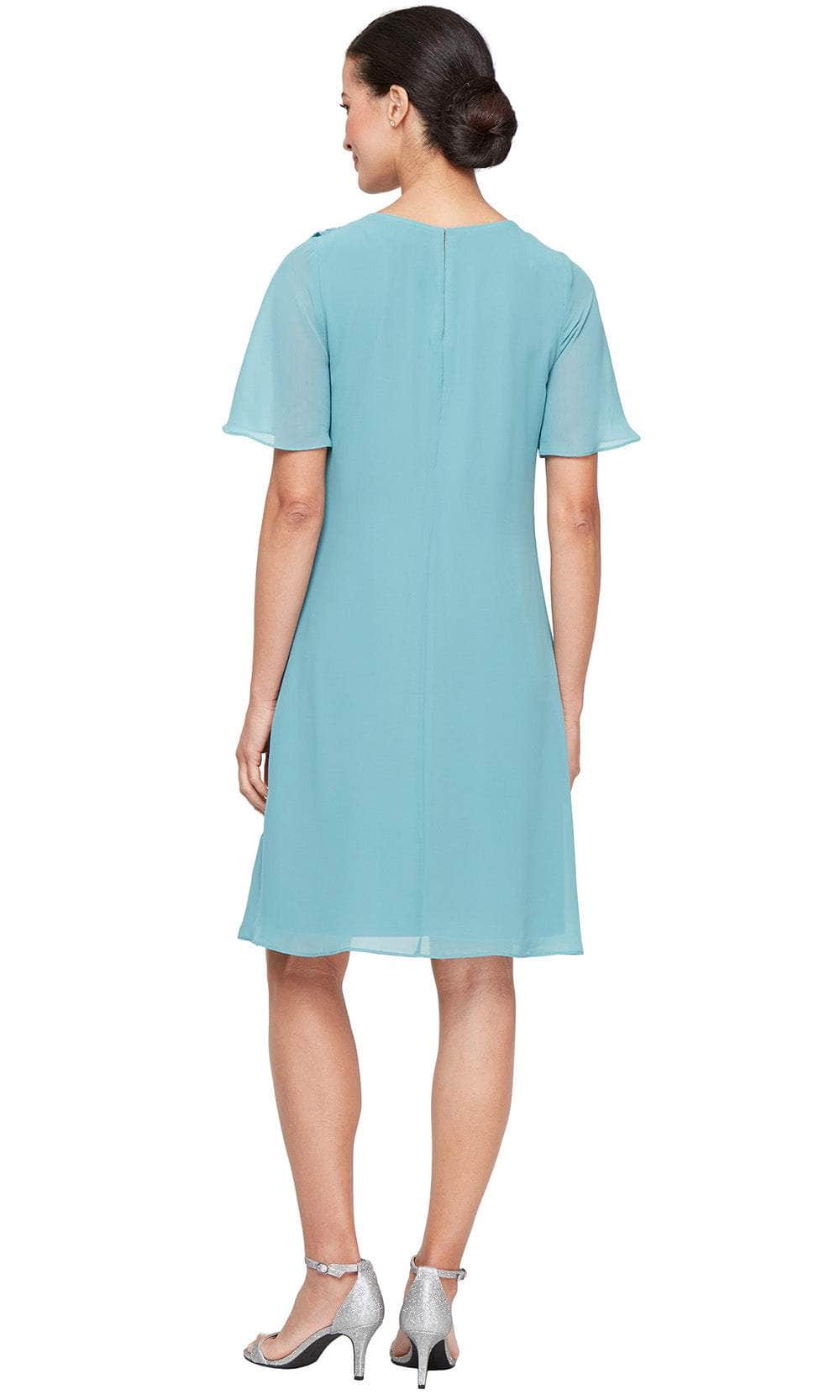 Refresh your occasionwear with the breezy charm of S.L. Fashions 9270737 creation. A tulip overlay bodice and shimmering beaded trim elevate the ethereal beauty of this chiffon dress. The sheer short sleeves and jewel neckline create a soft, feminine touch, while the sheath silhouette ensures both ease and sophistication. Its layered chiffon drapes beautifully, adding dimension to the entire look. From cocktail hours to daytime events, this S.L. Fashions 9270737 design captures subtle elegance and versatility. Model is wearing Sea color.