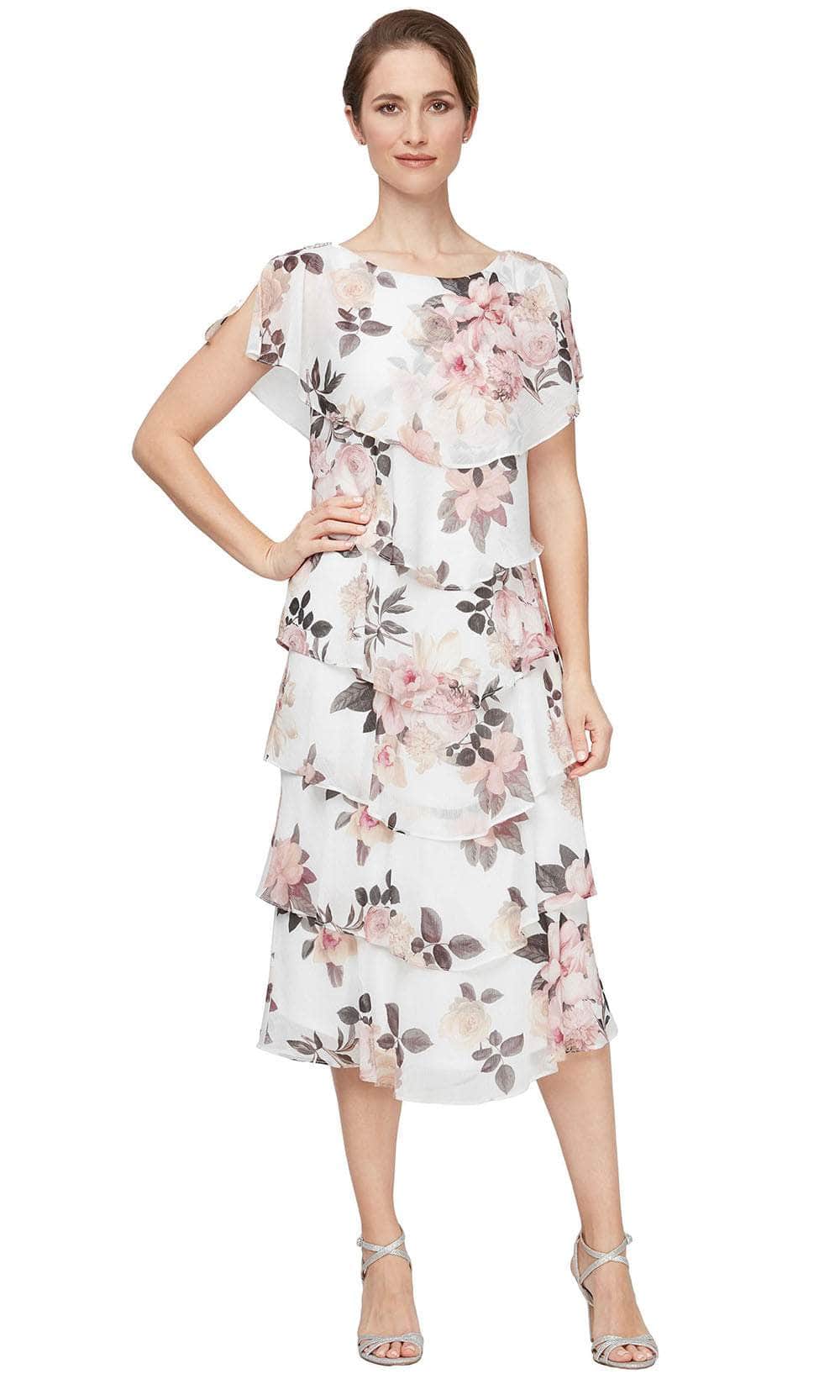 Delight in the fresh and airy feel of S.L. Fashions 9271803, a tea-length A-line dress featuring a charming floral print. The dress showcases tiered ruffle layers that add texture and flow, while the capelet sleeves with beaded embellishment at shoulders enhance its romantic appeal. A scoop neckline and full back design create a balanced and graceful silhouette. Designed for elegance and comfort, the S.L. Fashions 9271803 dress is perfect for garden parties, daytime weddings, or any occasion that calls for a light, floral look. Model is wearing Ivory/Pink color.