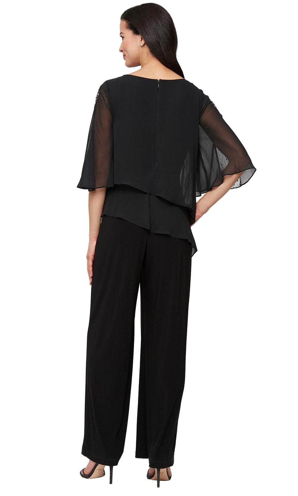 Capture the magic of timeless elegance with every step in this S.L. Fashions 9277537 masterpiece. This wide-leg jumpsuit is crafted from matte jersey for a flattering, comfortable fit and is elevated by a scoop neckline double tier overlay bodice. The quarter-length sleeves features beaded trim embellishments that add subtle sparkle to your ensemble, making it an ideal choice for special events. Effortless and versatile, S.L. Fashions style 9277537 is the perfect choice for women seeking a chic alternative to traditional gowns for weddings, galas, or cocktail parties. Models are wearing Black, and Iris colors.