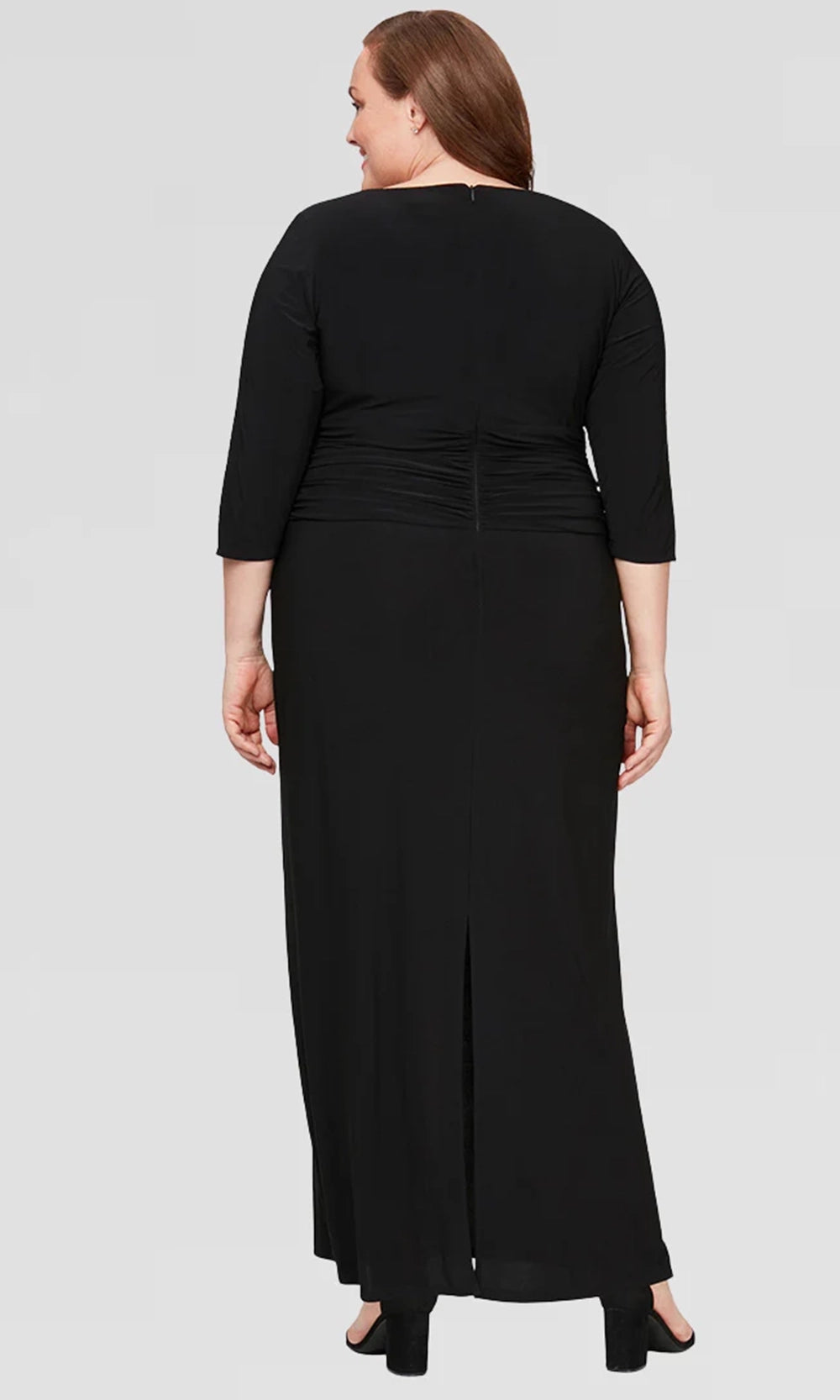 | Details: | Three-Quarter Sleeves, Embellished Mesh Insets, Ruched Waist, Center Back Slit |