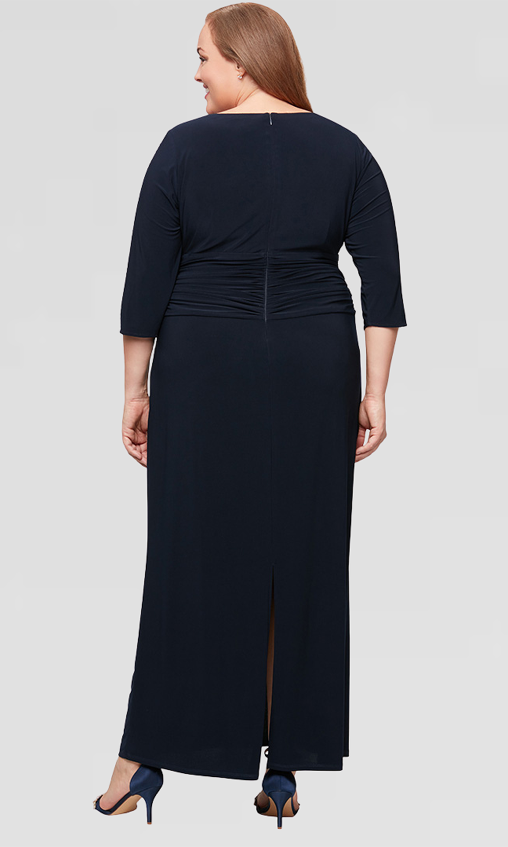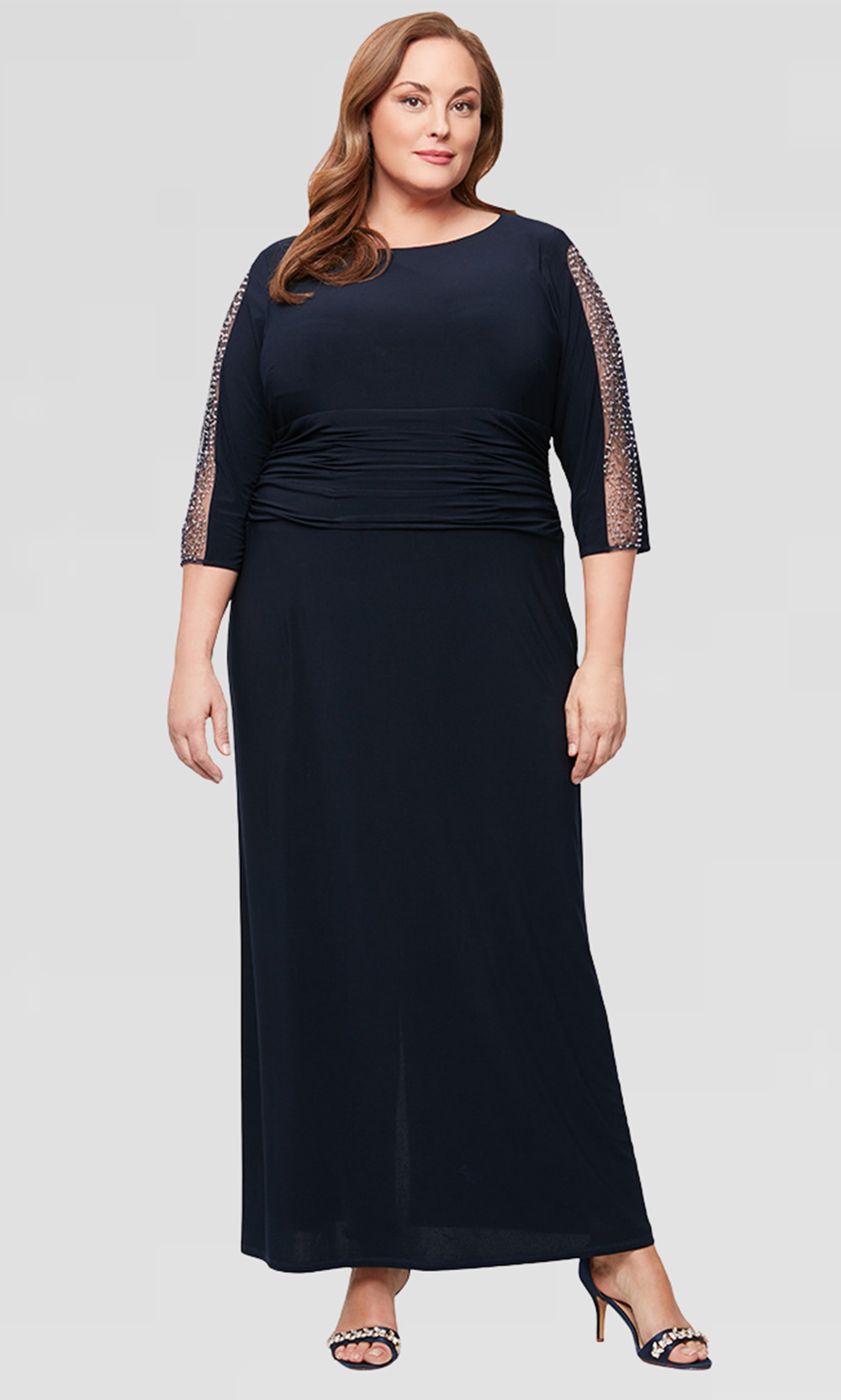 Exude sophistication with the S.L. Fashions 9435172 dress, an elegant statement of poise with its embellished mesh sleeve insets and column silhouette. The three-quarter sleeves create balanced coverage while the ruched waist highlights your figure with refined elegance. A scoop neckline offers a modest touch that complements its sleek design. Ideal for occasions that call for a graceful presence, this dress blends modern detailing with classic form. Let the S.L. Fashions 9435172 gown redefine your evening wardrobe with sophistication and confidence. Models are wearing Black, and Navy colors.