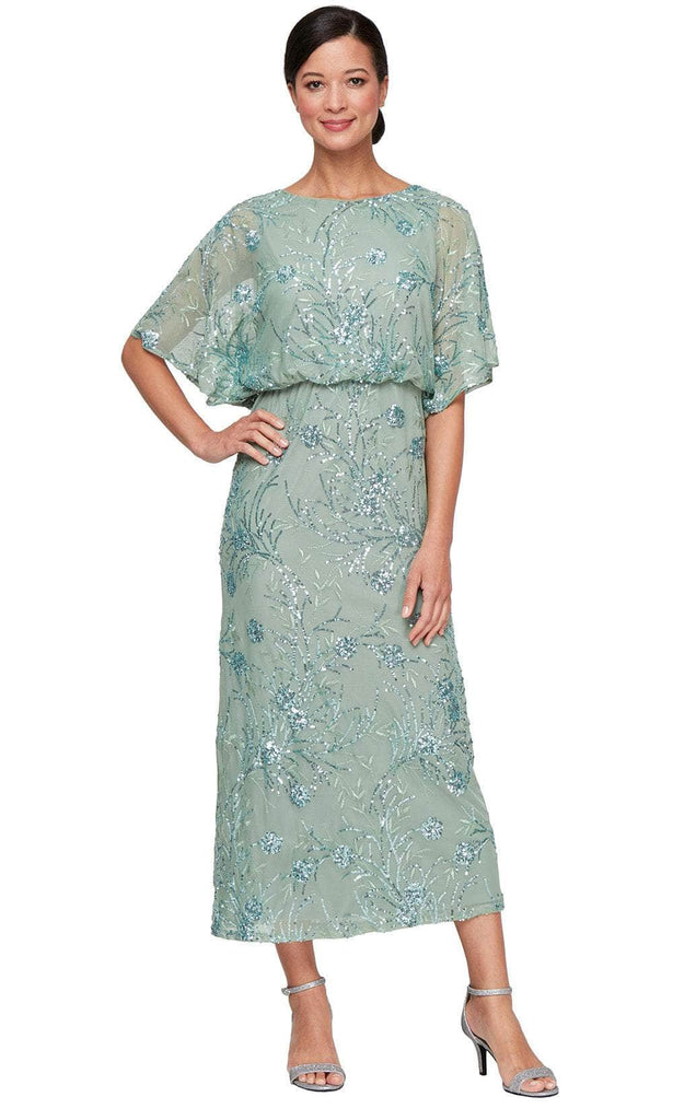 Shine with immaculate elegance in this gorgeous S.L. Fashions 9496478 creation. The dress will make a statement with its floral embroidered mesh and sequin embellishment. The blouson bodice and sheer capelet sleeves bring a touch of movement, while the tea-length sheath silhouette ensures a polished finish. Designed with a flattering bateau neckline, this dress effortlesS.L.y transitions from formal luncheons to evening receptions. Exude poise at your next sophisticated gathering in the S.L. Fashions 9496478 masterpiece. Model is wearing Sage color in Missy size for reference.