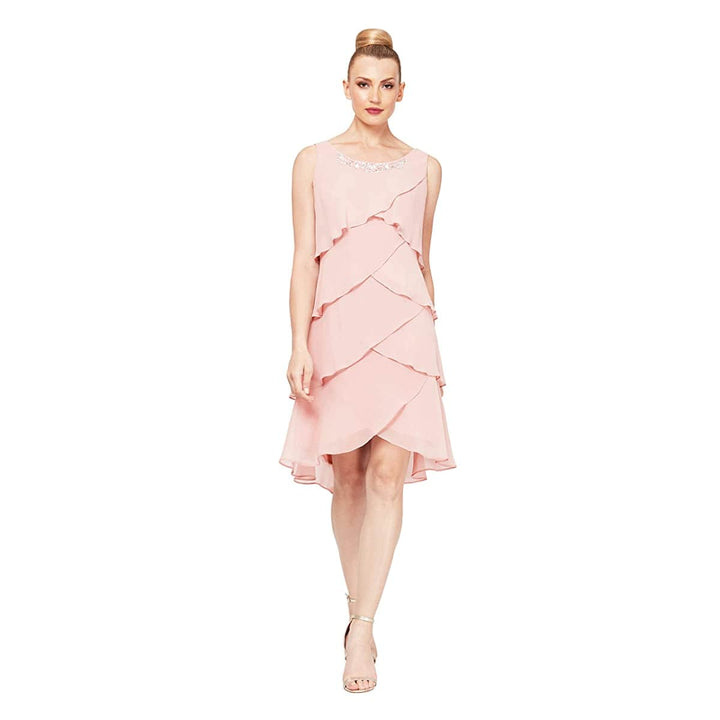 Bring out that fairylike glamour with a knee-length layered gown that interlocks like petals on a blooming rose. The bodice is loosely fitting for an light and airy look, topped with a sleeveless jewel neckline adorned in crystals. A removable short sleeved jacket sports a cape style, perfect for a simple look transformation. Model is wearing the Faded Rose color.