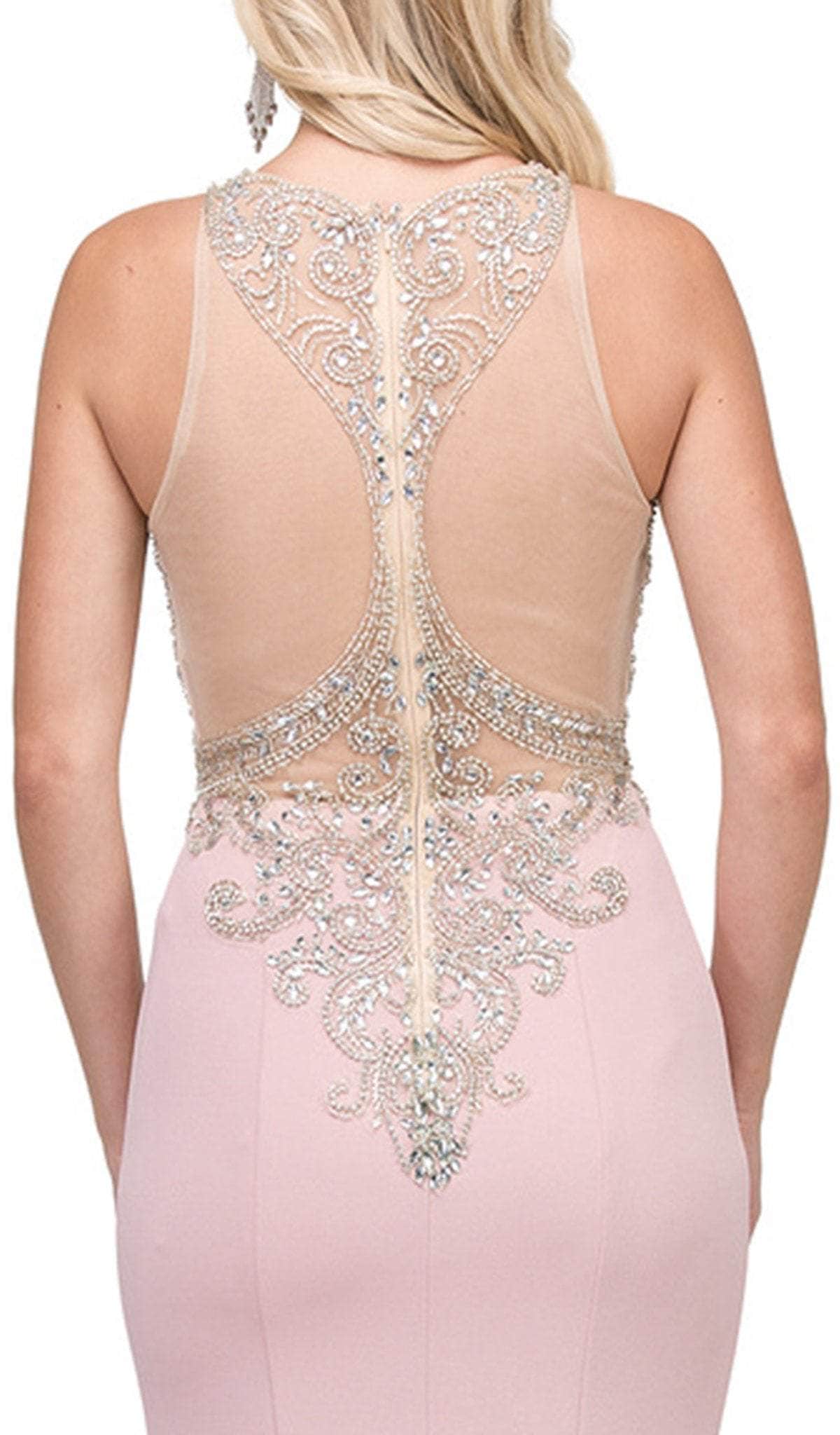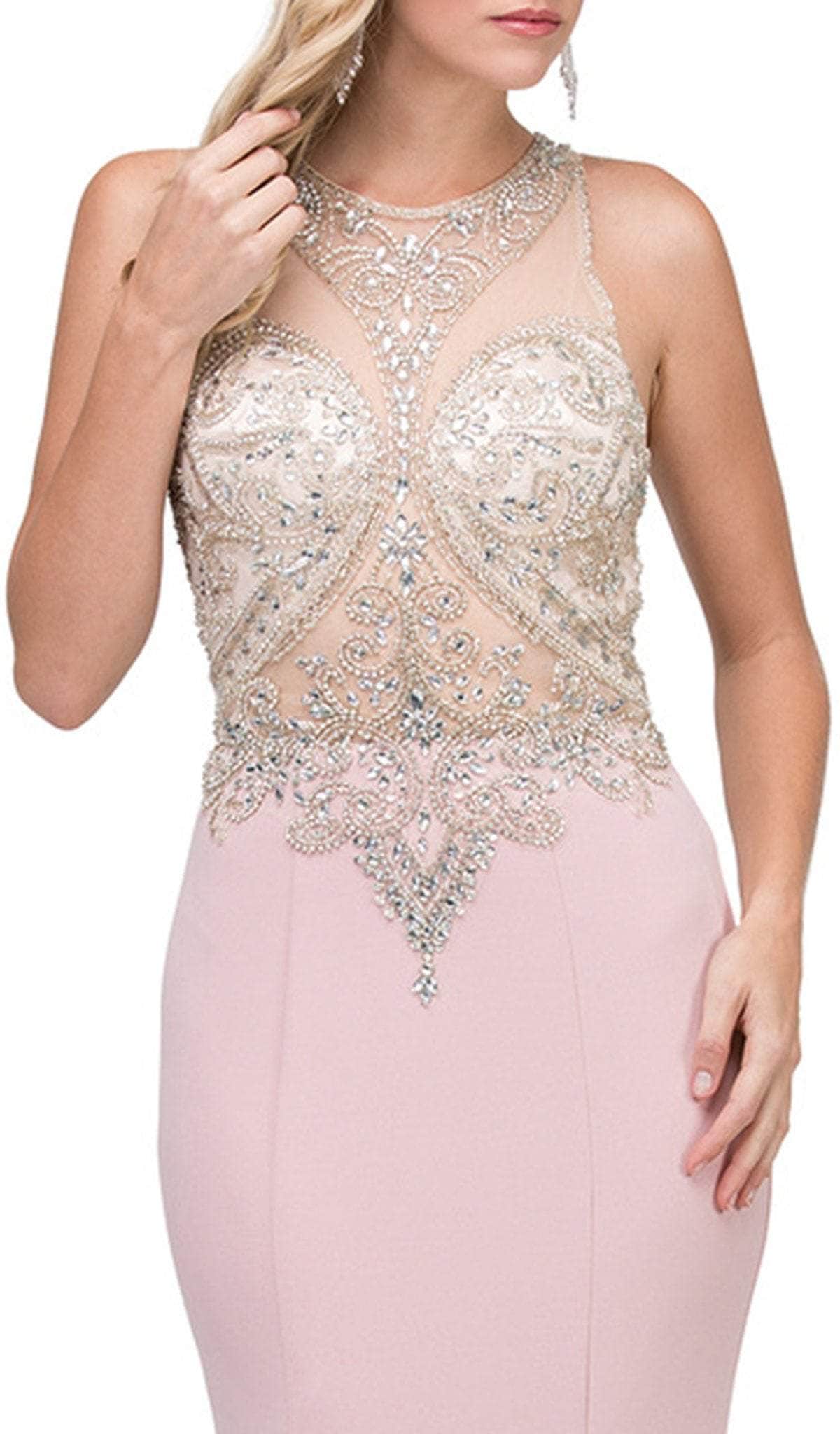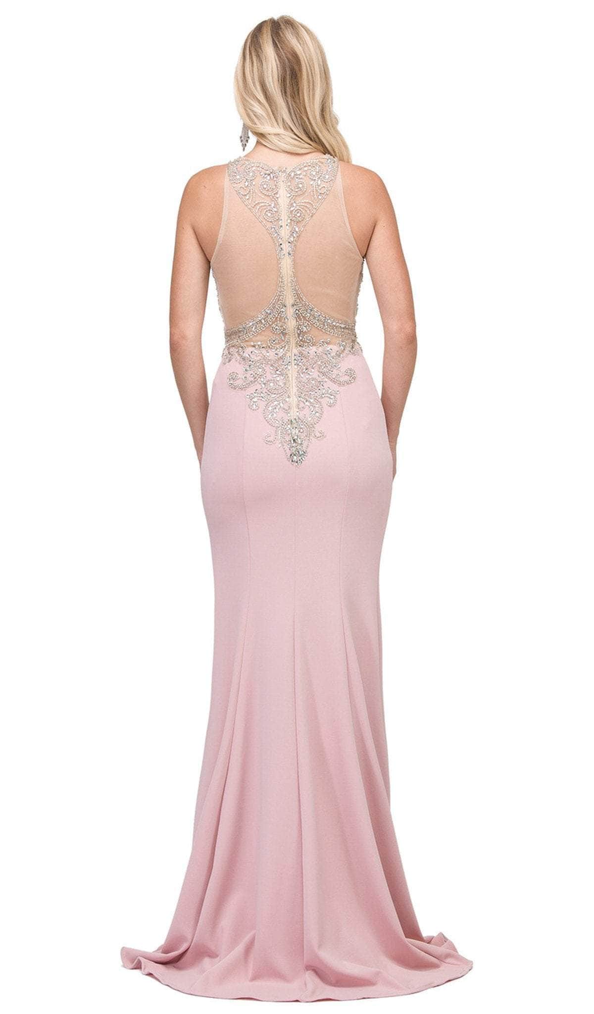 Bring a breathtaking new look to prom night in this stunning special occasion creation by Dancing Queen - 2433. Intricately adorned with beautiful patterns of jewel accents, this sleeveless dress features an illusion halter neckline on a fitted bodice secured with a back zipper closure for a perfect fit. Starting from its natural waistline, the skirt flourishes to a sheath silhouette as it cascades to a full length and finishes in a sweep train. This gorgeous masterpiece by Dancing Queen - 2433 is charming and versatile, perfect for red carpet events, social galas, destination weddings and prom. Model is wearing Dusty Pink color.