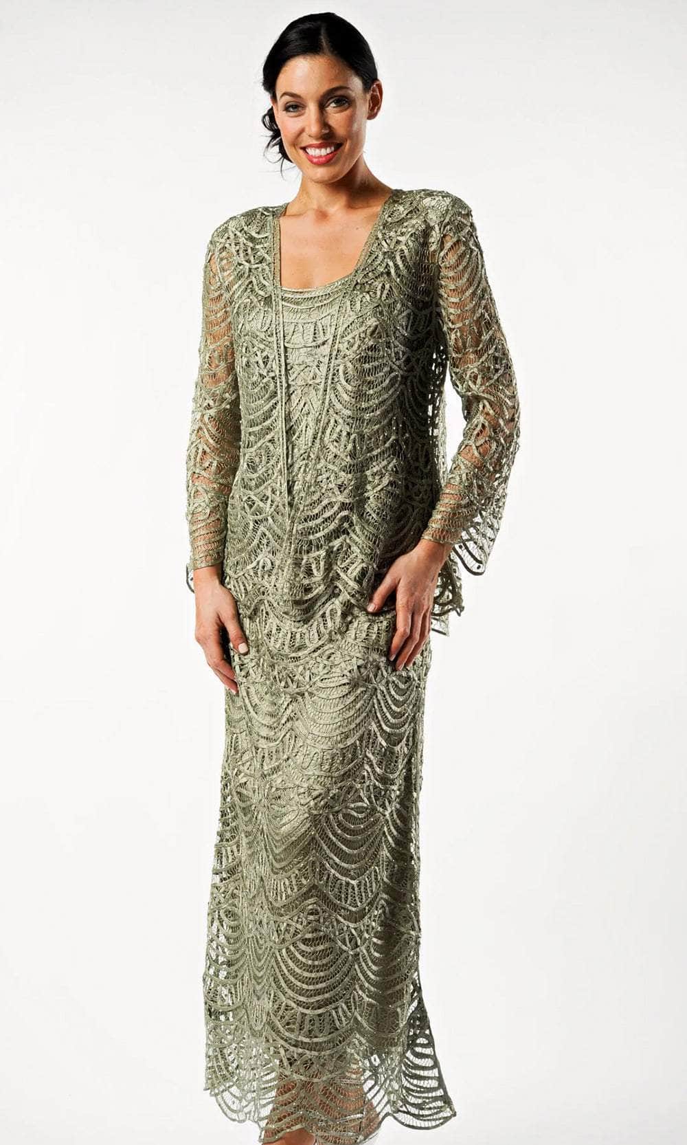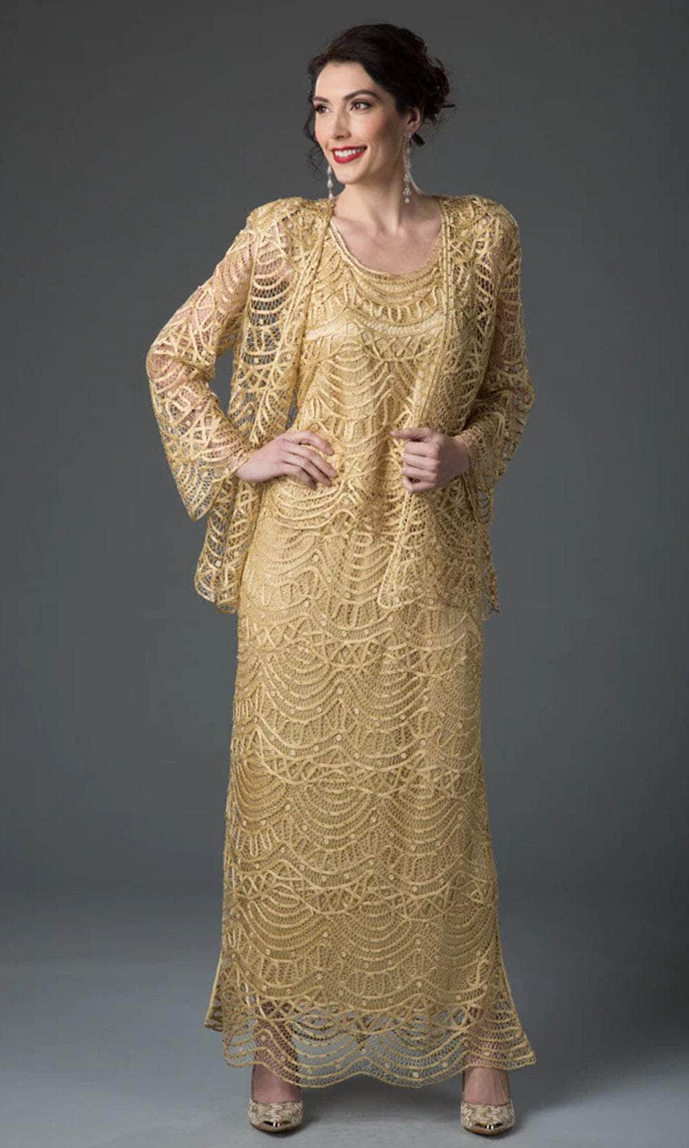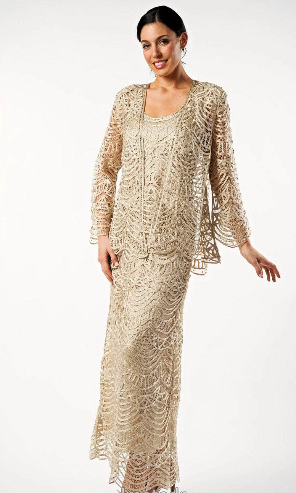 This elegant three-piece evening dress features scallop hem lines, with gentle draping designed to flatter a woman’s curves. Top and dress lined with soft silk for extra comfort, and unlined jacket highlight Soulmates signature hand-embroidered beading. Hem is designed for ease of alterations as it is shortened without changing the look of the dress. A perfect choice for a glamorous evening.