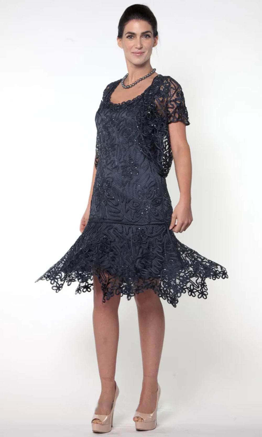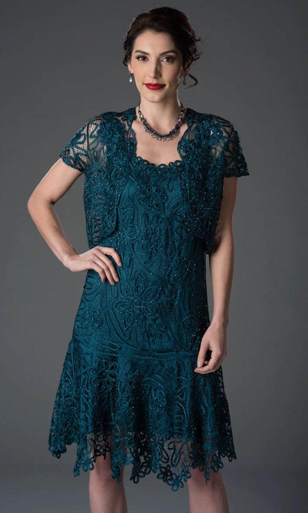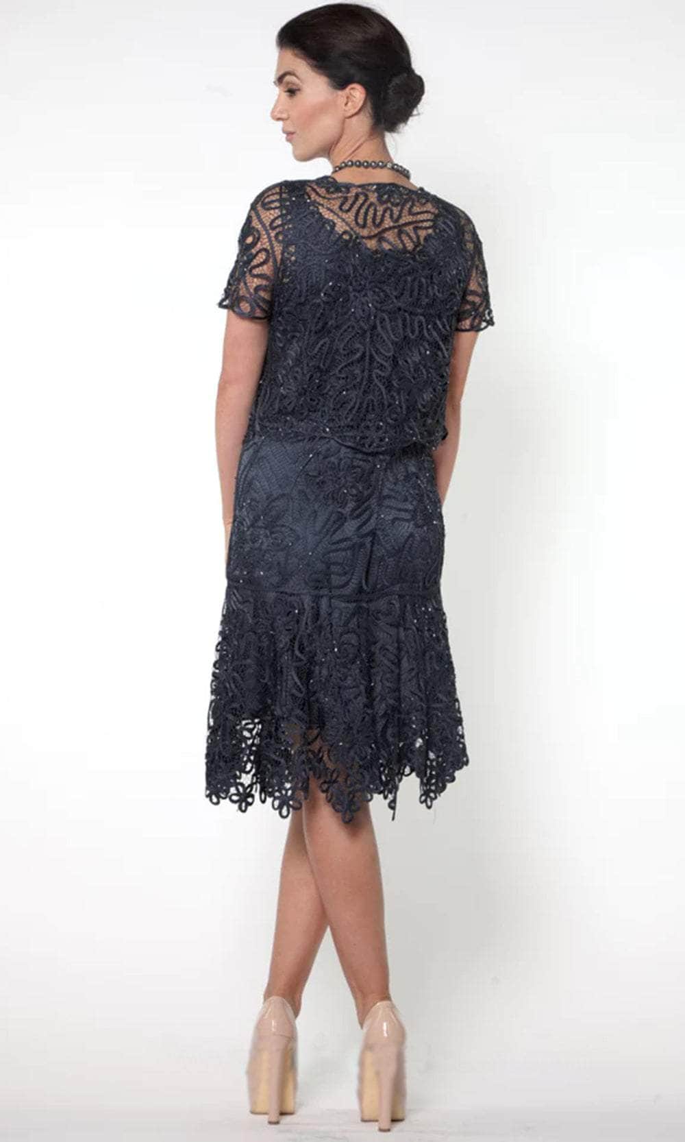 - This drop-waisted short dress is a feminine twist on a cocktail dress that is completely in tune with Soulmate's refined design. This slimming shape is fully lined in the dress for a pleasant feel and is designed with a tiny cap-sleeved jacket for a little extra coverage. Women adore the flared skirt, which highlights the lovely floral crochet. Ideal for bridesmaids or any special occasion.