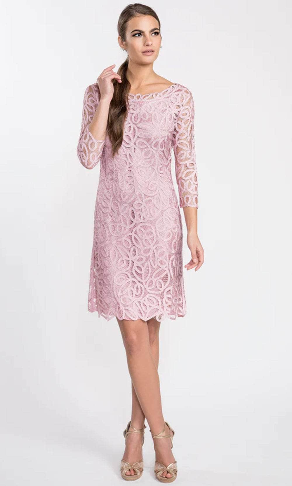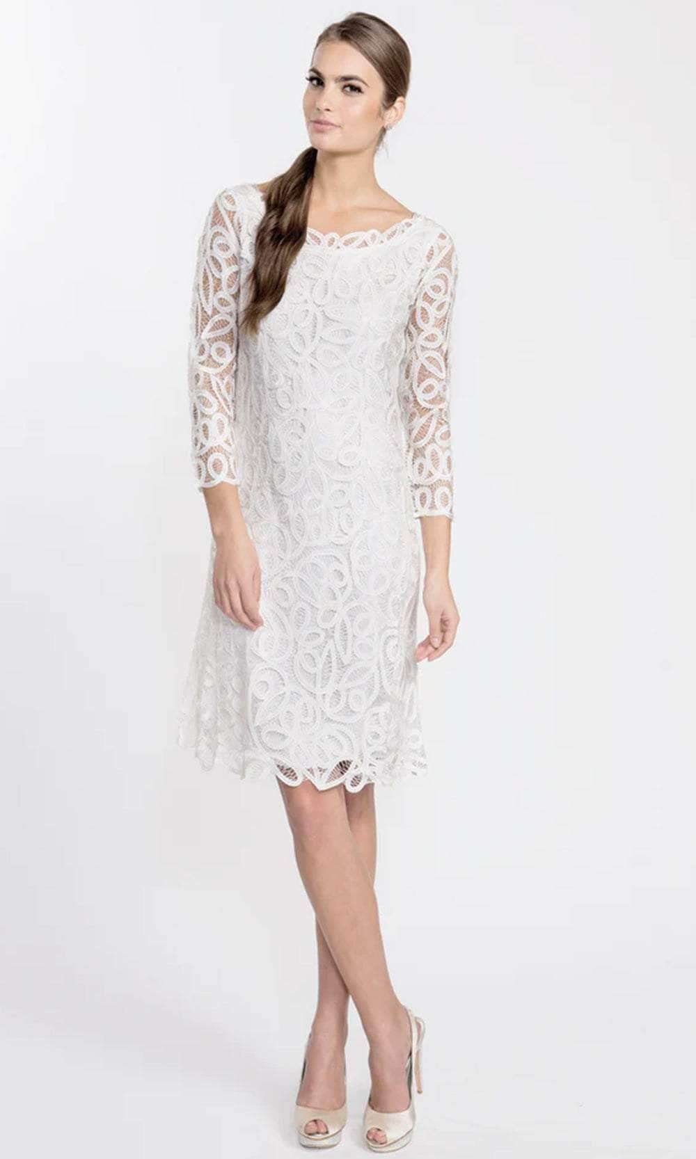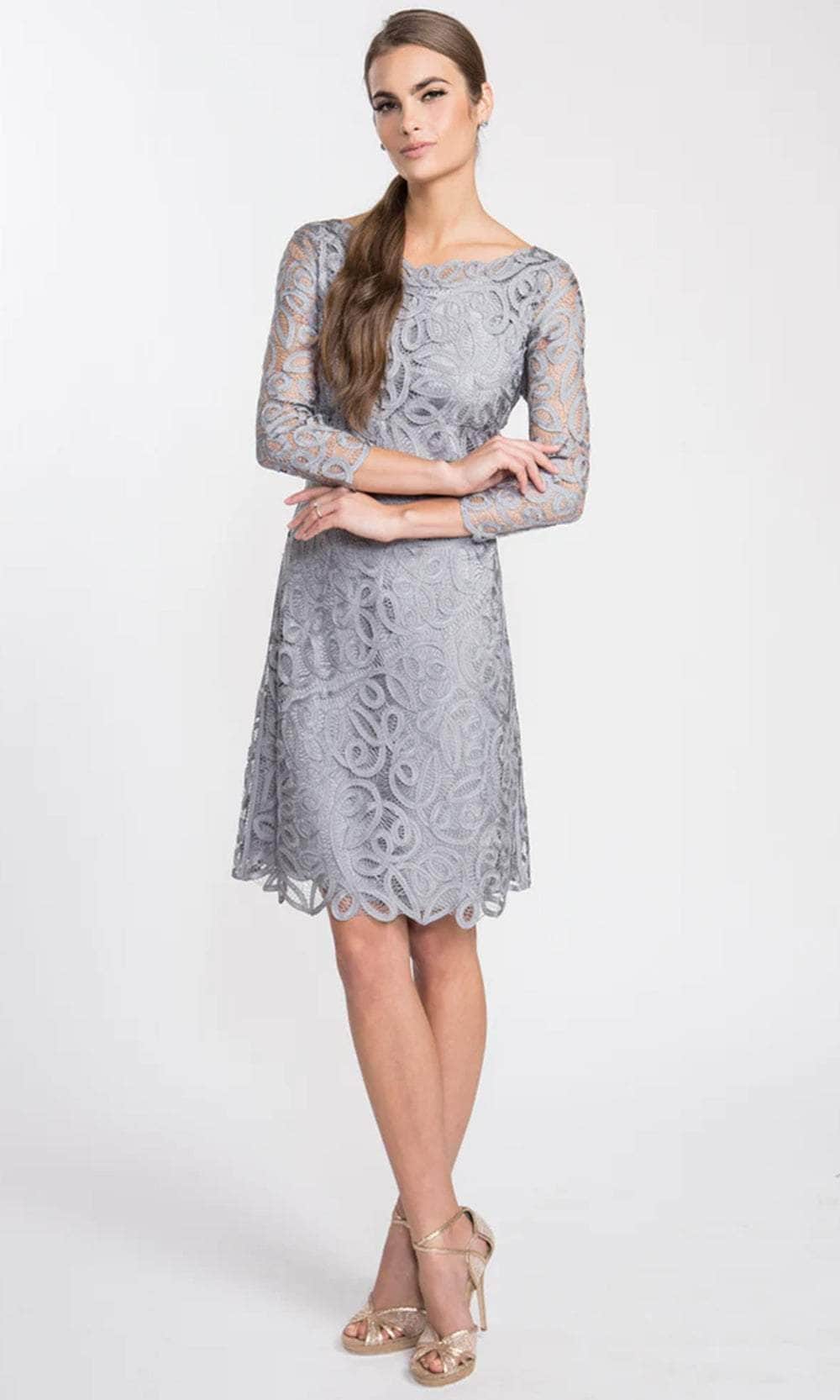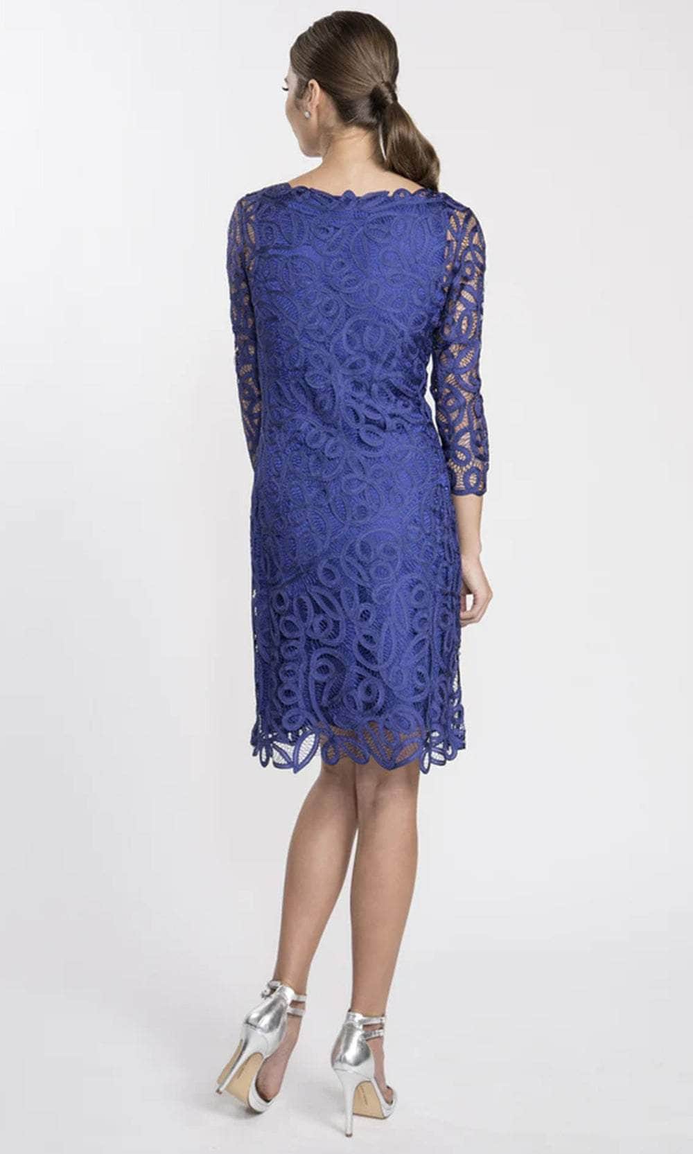 In this knee-length, three-quarter sleeve dress, you'll look glamorous and timeless. Fitted to the waist, the lace hem falls just below the knee. Silk underlay ensures a snug fit. Consider yourself strolling down the Seine in it.