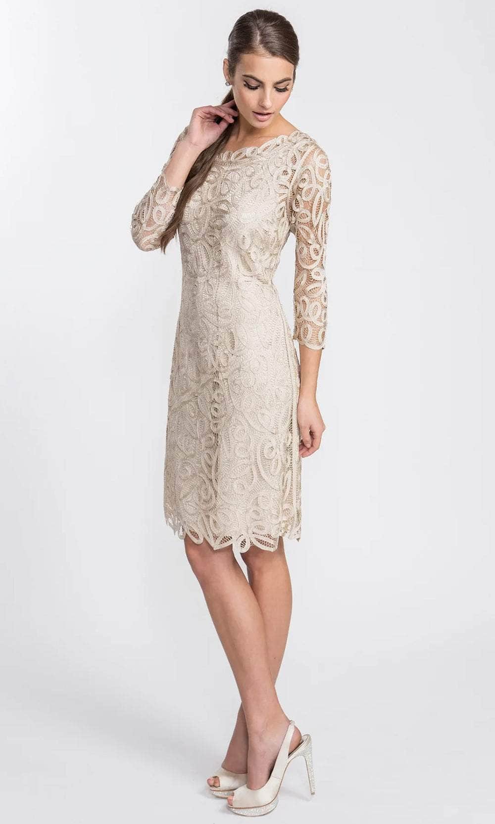 Be glamorous and timeless in this knee length, three-quarter sleeve dress. Fitted to waist and the lace hem falls right right below the knee. Silk underlay ensures a comfortable fit. Imagine yourself strolling along the Seine in it.