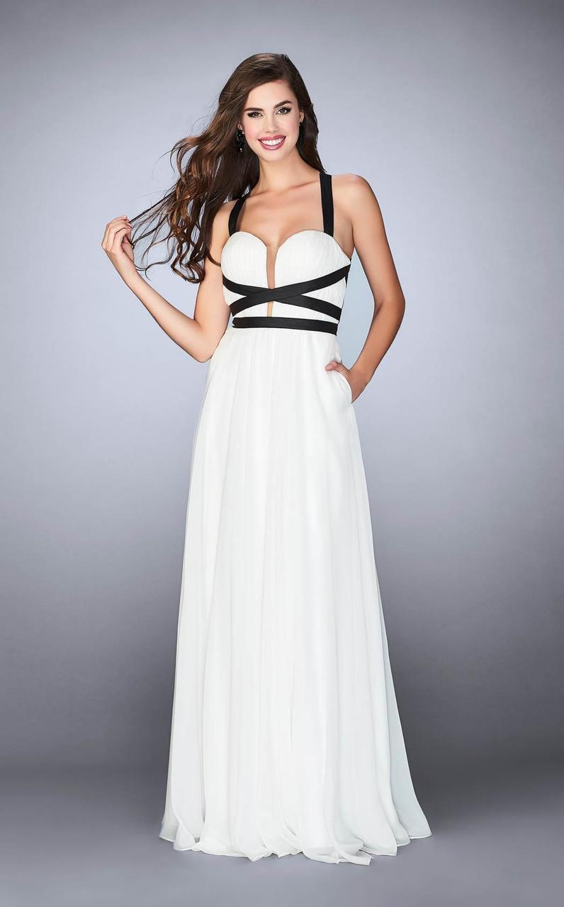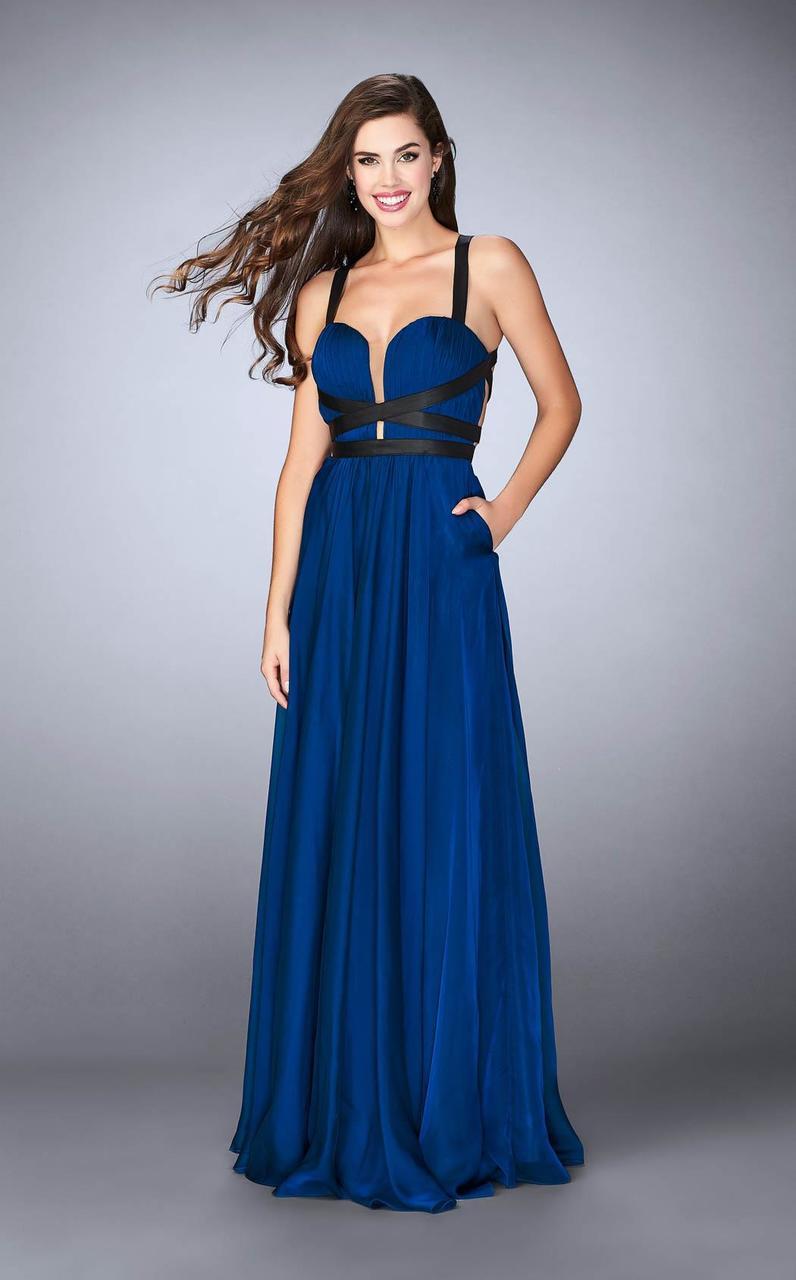 Brave the evening with temptress beauty and grace wearing this gallant Prom Dress by La Femme. A bold chiffon dress with vegan leather straps across the front and back. The skirt features side pockets, shirred down to the floor length creating a beautifully flowing full skirt. This stunning La Femme creation is sure to get you noticed on that special affair!