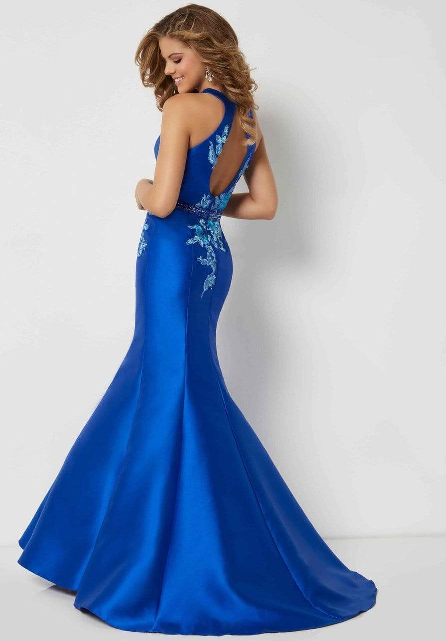 This gown is sculpted with aåÊMikado trumpet silhouette. This ensemble has a halter neckline with keyhole cutouts on the front and back. The silhouette is decorated with contrasting floral lace scattered with sparkling rhinestones.