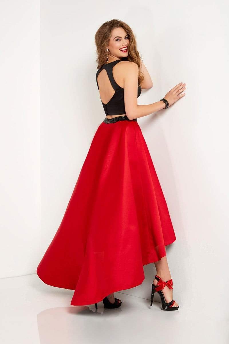 Get with the trend of the season by wearing this gorgeous two-piece gown. The satin bodice features a jewel neckline with a cut out back. The satin high-low skirt is equipped with a stunning beaded belt.