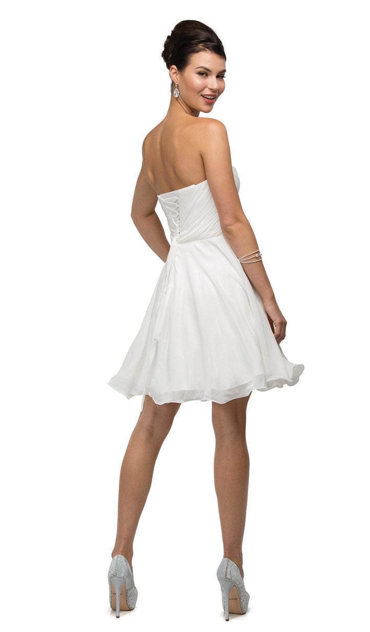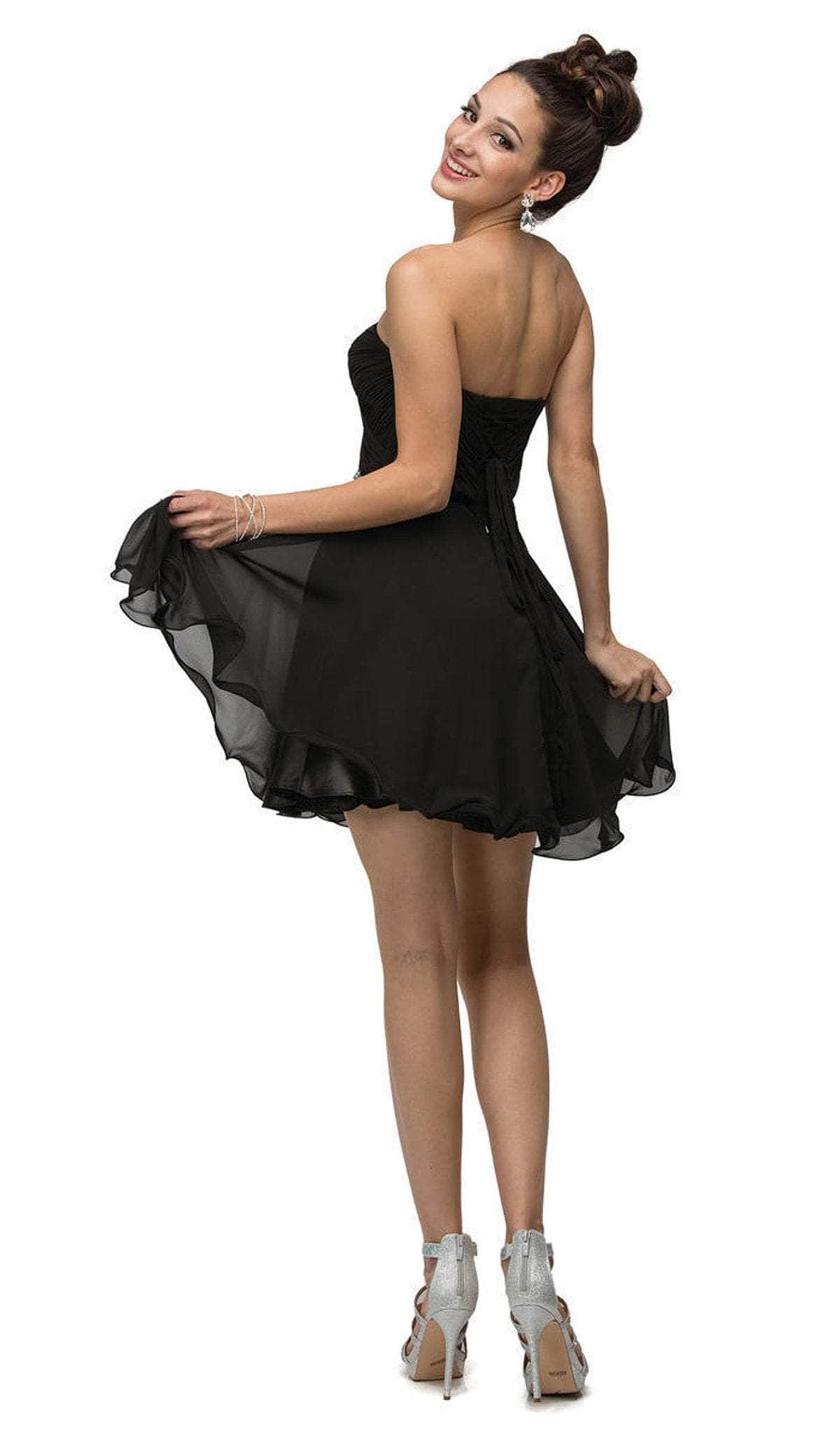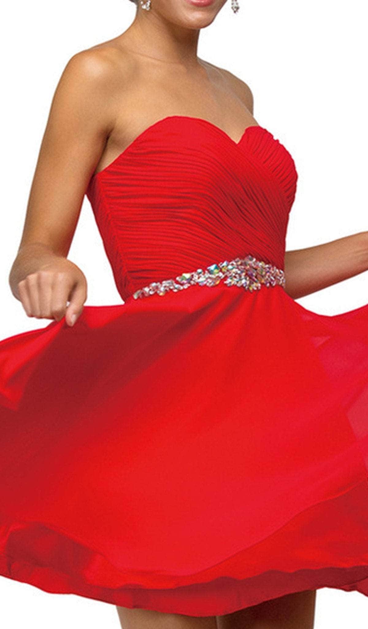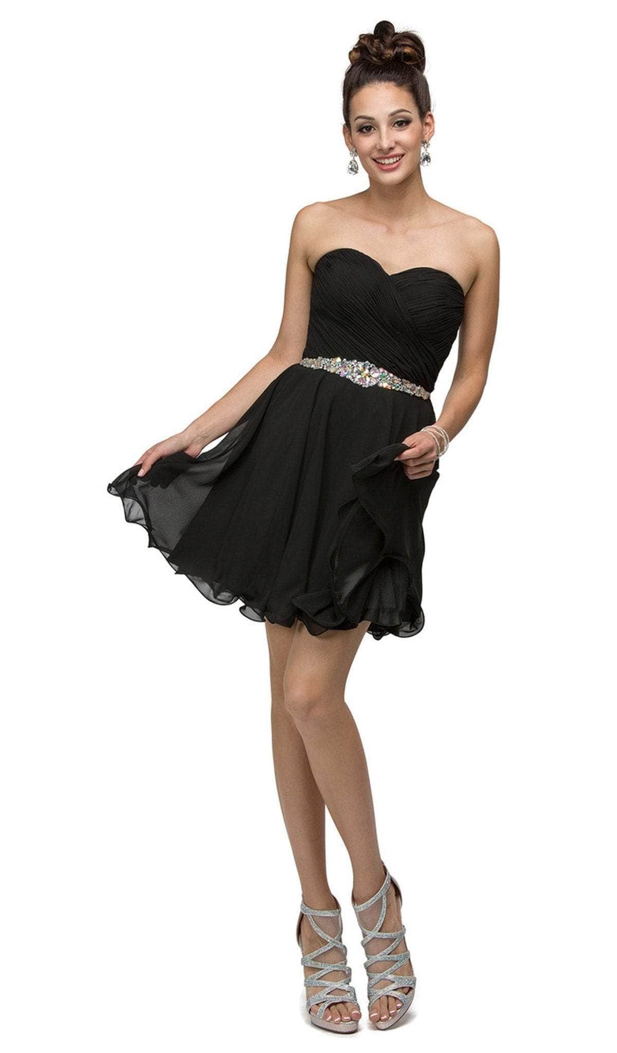 This stunning masterpiece by Dancing Queen 9115 brings together all the essentials for a great look at prom or a party! The strapless sweetheart bodice is elegantly ruched to the natural waist and adorned with a crystal stones encrusted belt for a sophisticated touch. This figure-flattering ensemble flutters to the mid-thigh hem in glamorous waves. Radiate a fascinatingly beautiful flair in this charming Dancing Queen 9115 creation. The models are pictured wearing the colors Burgundy, Aqua, Silver, Black, and White.