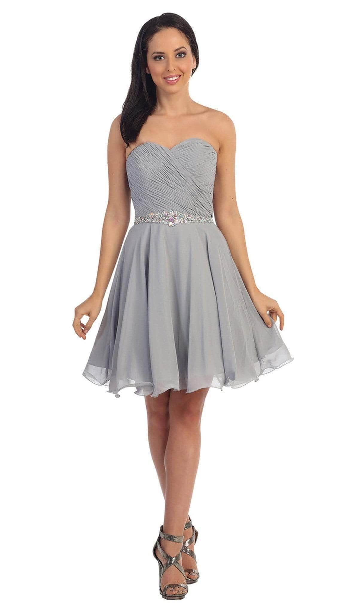 | Details: | Strapless, Ruched bodice, Back Corset, Jewel Encrusted Belt, Layered Chiffon Skirt, Short Hem |