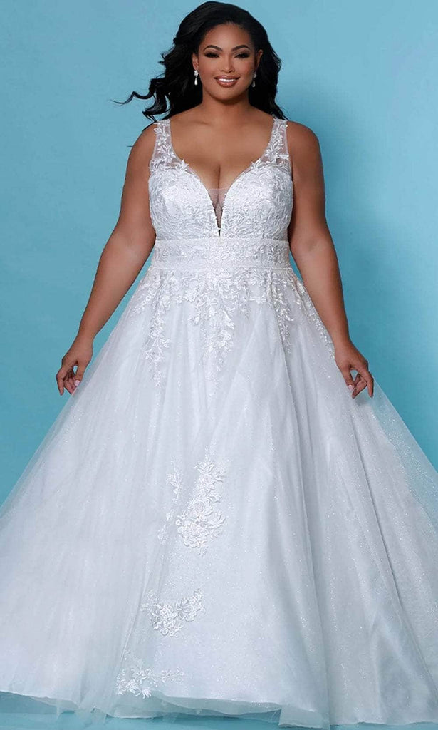 Breathe verve and sophistication into your wedding day in this Sydney's Closet Bridal SC5255 creation. Detailed with a bouquet of embroidered florals allover the bodice, this gown parades a plunging v-neckline with a sheer inset. Rhyming with an ornate sheer v-open back and a nipped waist, the A-line skirt flows into a romantic sweep of train. Make magic in this grandiose Sydney's Closet Bridal masterpiece. The collection of bridal outfits from Sydney’s Closet is appreciated for its elegance and sophisticated charm specifically tailored to ensure perfect and comforatable fit to a real curvy body. Model is wearing the Ivory color.