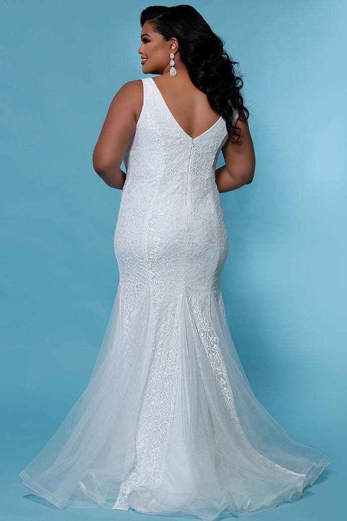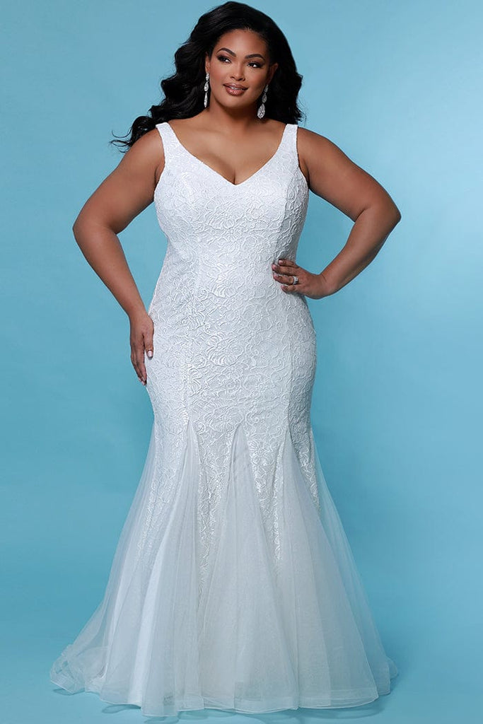 Strike a pose as you enter the room in this exquisite Sydney's Closet Bridal SC5258 gown. Tailored in all-over lace, this piece fashions a fitted bodice framed with a V neckline and V-back supported with wide shoulder straps. The mermaid skirt is styled with godets tulle and sweep train. Bloom with beauty and love as you saunter towards forever in this Sydney's Closet Bridal masterpiece. The collection of bridal outfits from Sydney’s Closet is appreciated for its elegance and sophisticated charm specifically tailored to ensure perfect and comforatable fit to a real curvy body. Model is wearing the Ivory color.