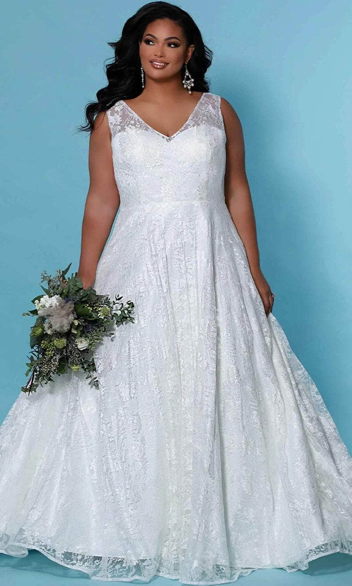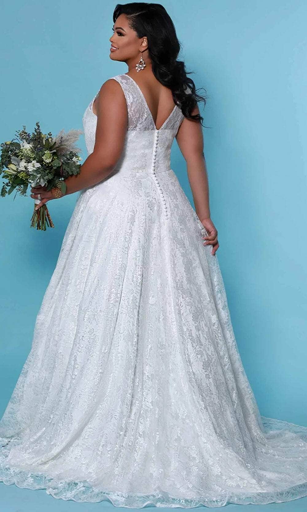 Be bound to steal the spotlight in this Sydney's Closet Bridal SC5262 creation. Tailored in a floral lace silhouette, this gown flatters with a v-neckline over a sweetheart lining. The back is carved with a sheer v-open style with fabric buttons trailing down its wake. Graced with a nipped waist, the A-line skirt flutters beautifully into a sweeping denouement. Enthrall everyone as you make a grand entrance in this Sydney's Closet Bridal masterpiece. The collection of bridal outfits from Sydney’s Closet is appreciated for its elegance and sophisticated charm specifically tailored to ensure perfect and comforatable fit to a real curvy body. Model is wearing the Ivory color.