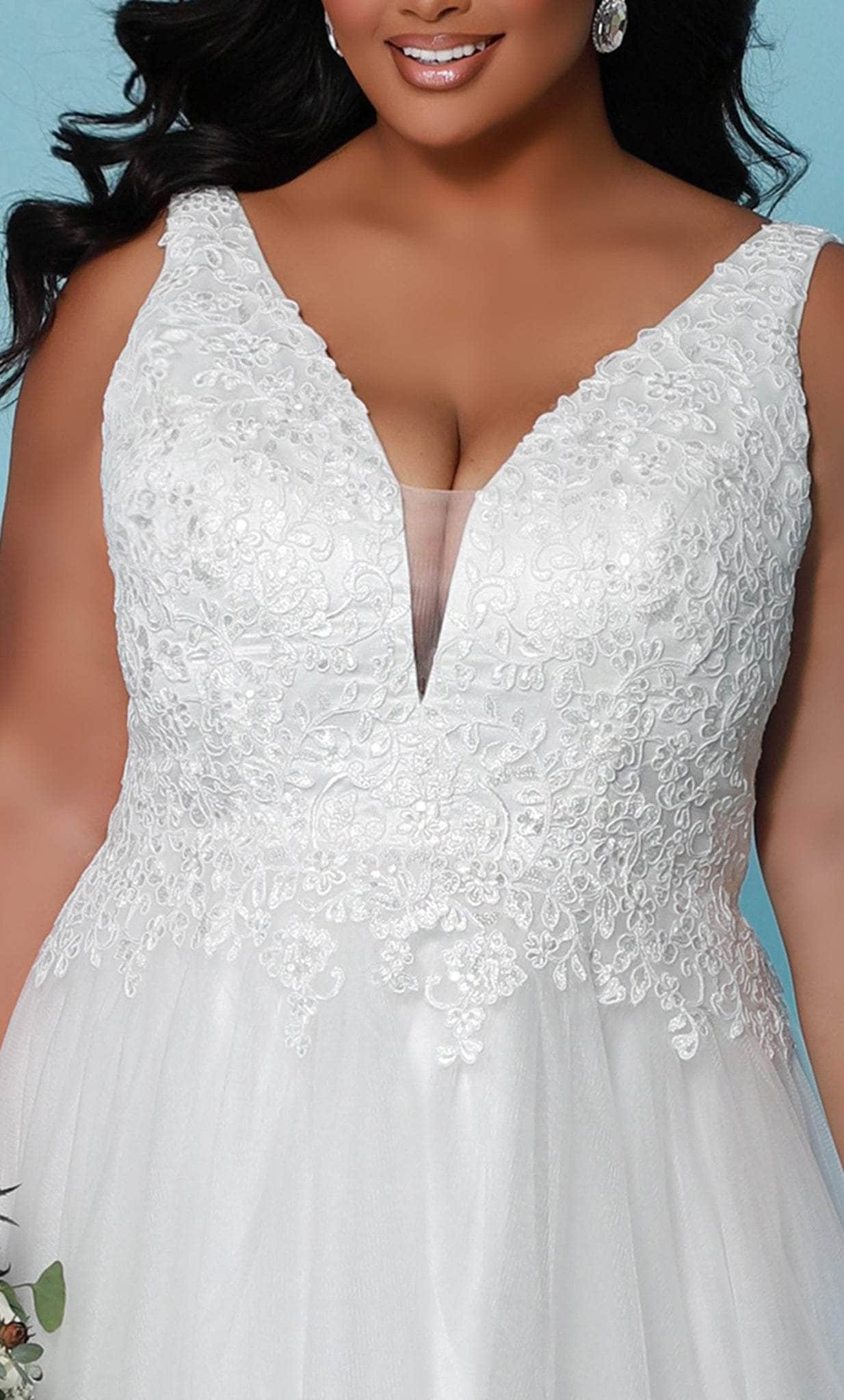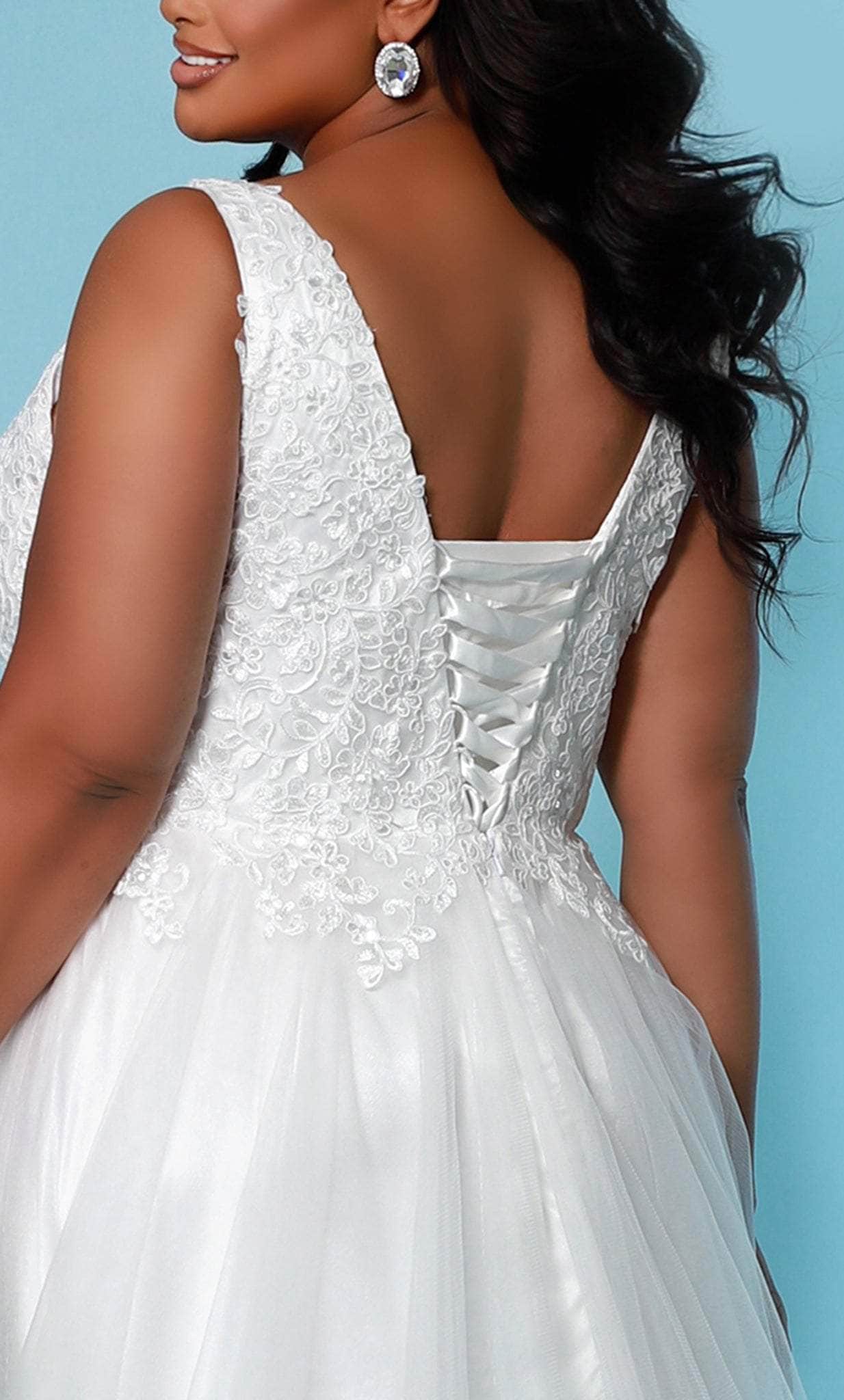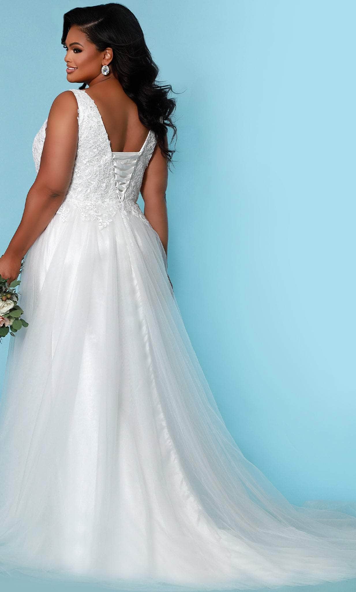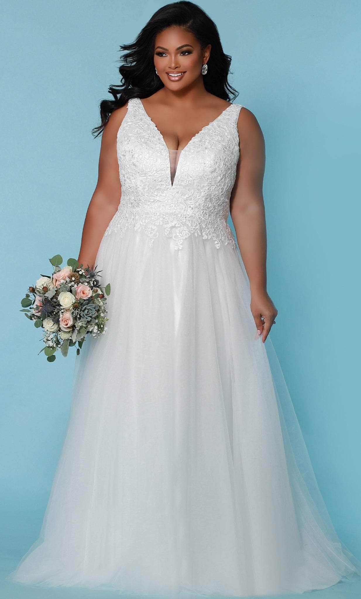 Get glamorous underneath the modern and classic detailing of this wedding dress by Sydney's Closet SC5270. This dress is accented with bra-friendly straps and V-neckline bodice. Its bodice is fashioned from a lace fabric with intricate details that runs just below its natural waist. In addition, this dress is made more perfect for weddings with its sheer skirt, fully-lined with satin that drapes down into a whole floor-length fabric. Also, lace-up and A-line dresses are the gold standard to any dream wedding. So slip into this elegant Sydney's Closet SC5270 for a sensational effect that will wow the crowd as you make a lasting impression. Model is wearing Ivory color.
