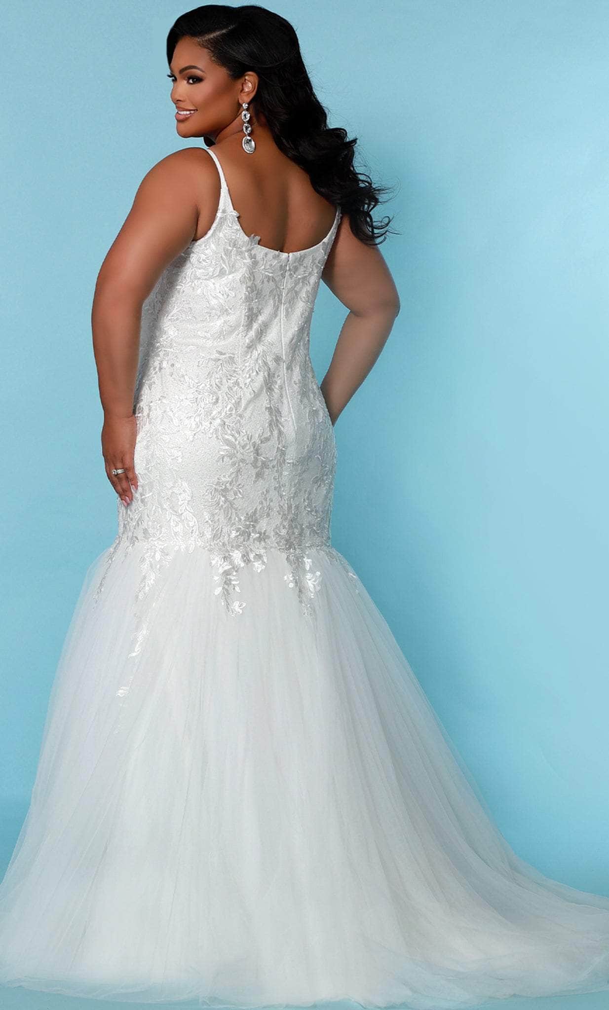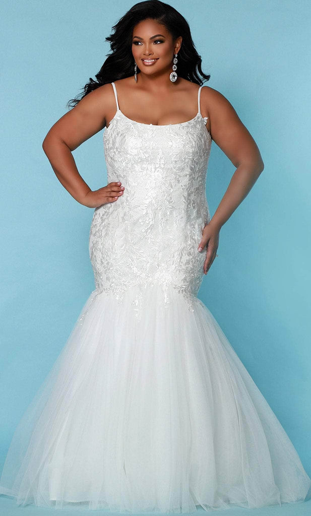 Sydney's Closet SC5278 wedding dress offers an incredibly romantic look that makes it perfect for today’s modern bride. Simple details like scoop neckline on a spaghetti straps makes this gown more sophisticated than it already is. The defined transition from fitting body to a flared hem is giving a mermaid shape to the bride. Has distinct embroidery details that is important in every wedding dress! Back is also cut in scoop and finishes with a sweep train. This Sydney's Closet SC5278 gown is designed to fit and flatter women. Model is wearing Ivory color.