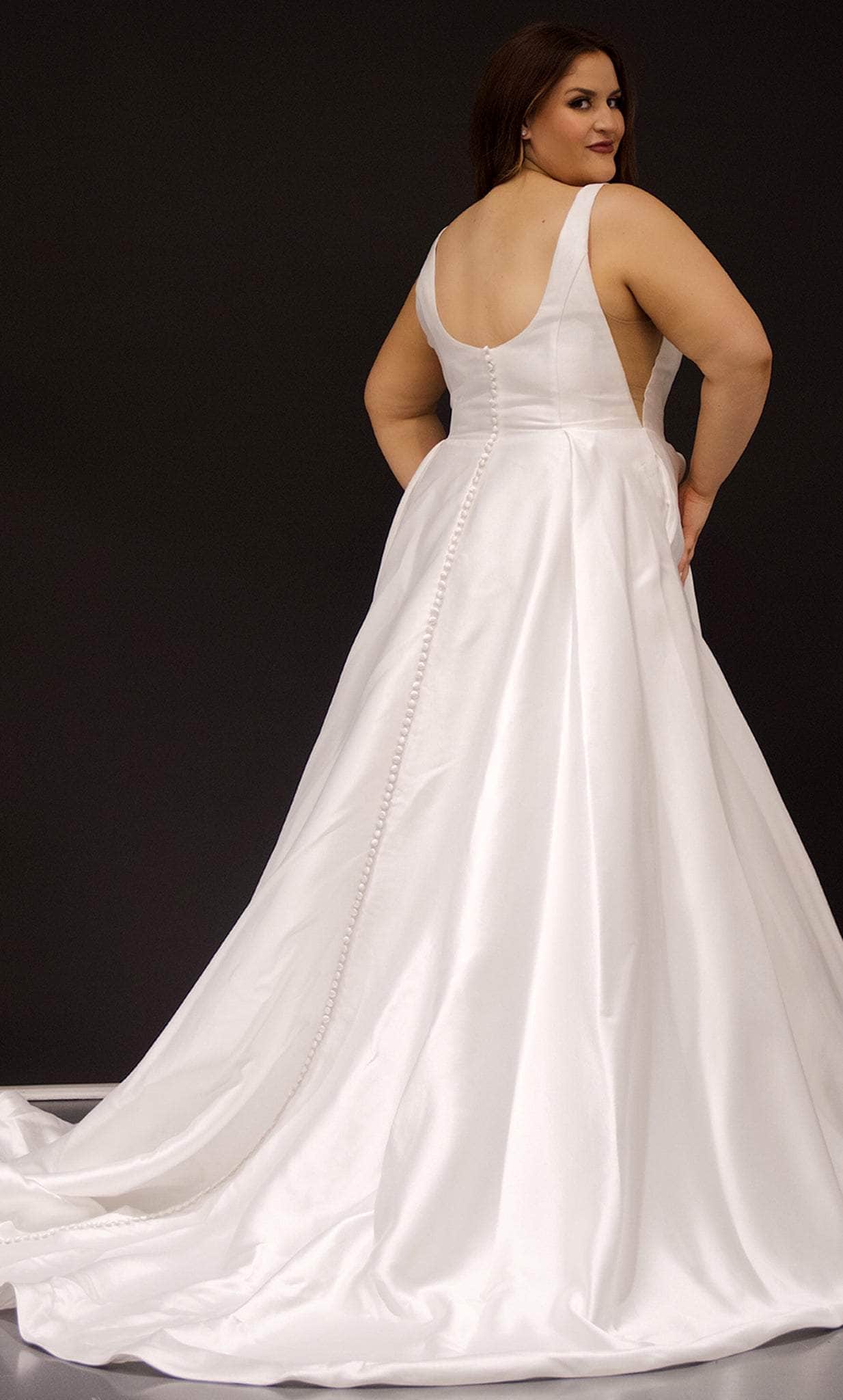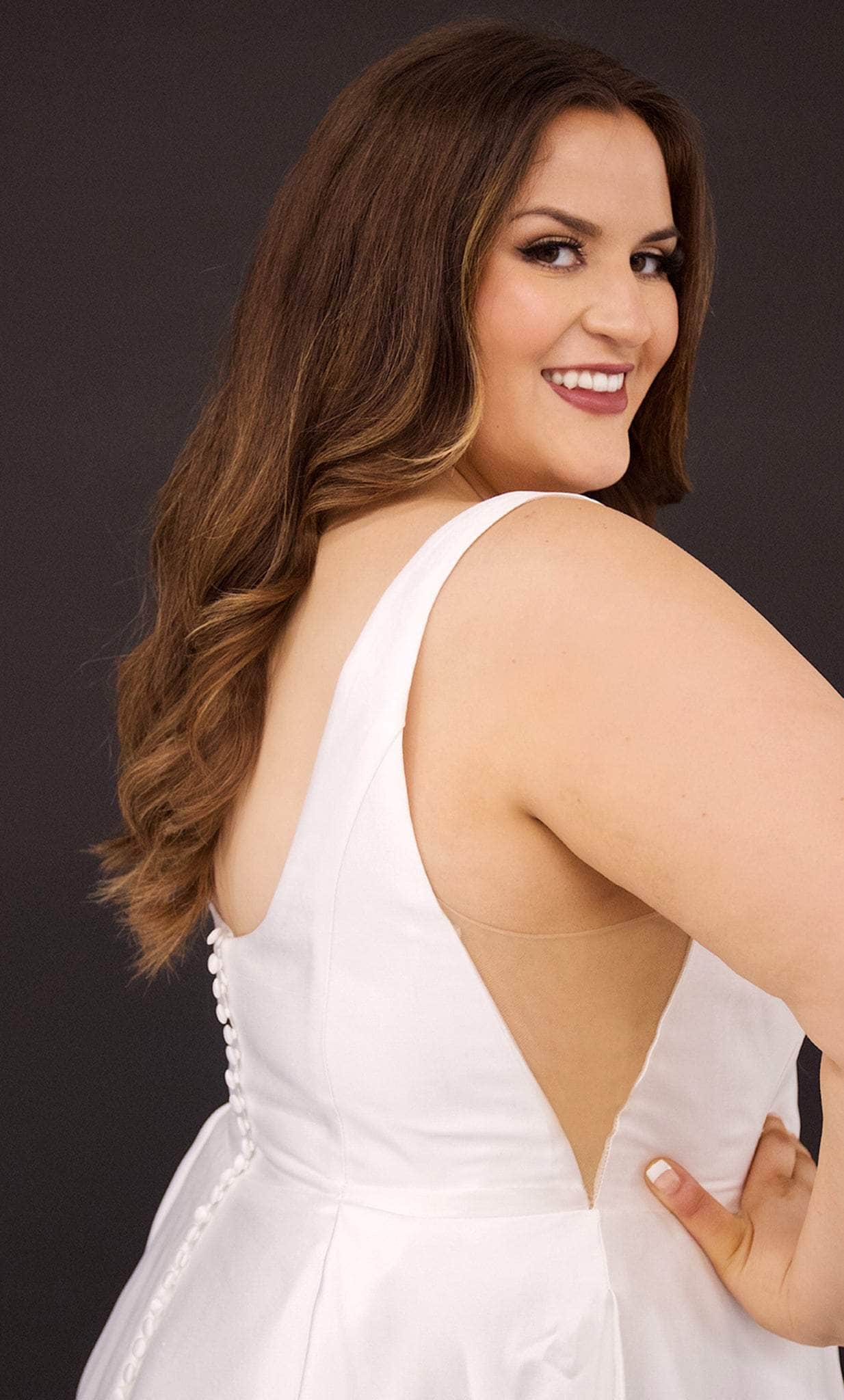 Charm everyone by your sheer femininity as you sparkle with beauty in this impeccable Sydney's Closet SC5293 creation. The scoop cut at the back of the fitted bodice's square neckline. An optional modesty panel is also included, although it has a triangle cut out of nude mesh under the arm. The A-line skirt has pockets, a sensual slit, and a chapel train to make it even more gorgeous! The row of buttons running from top to bottom on the gown's back is a remarkable feature. Sydney's Closet SC5293 wedding dress allows you to customize a look that’s all your own. Model is wearing Ivory color.